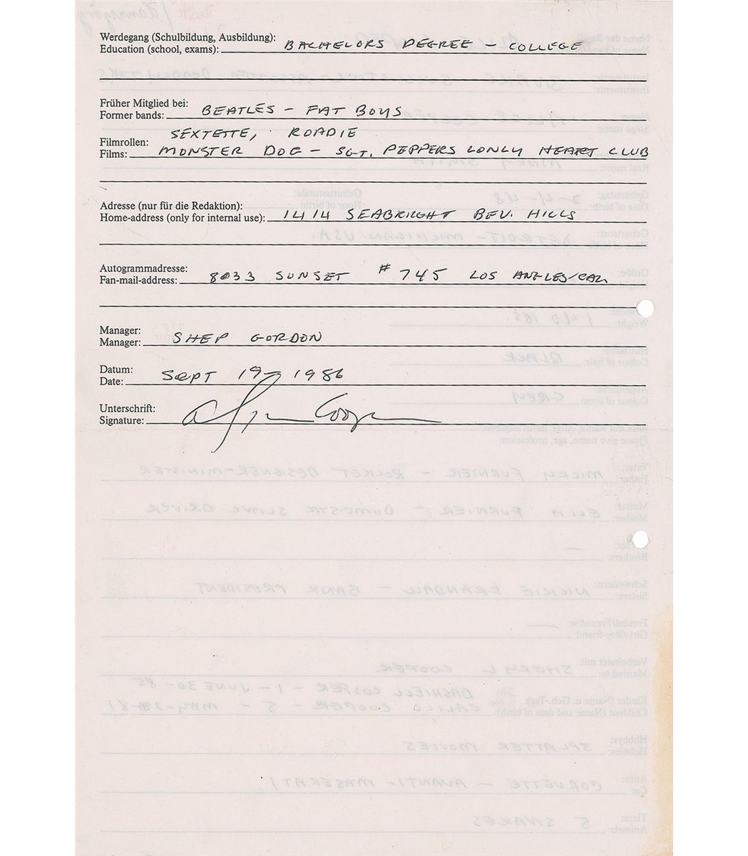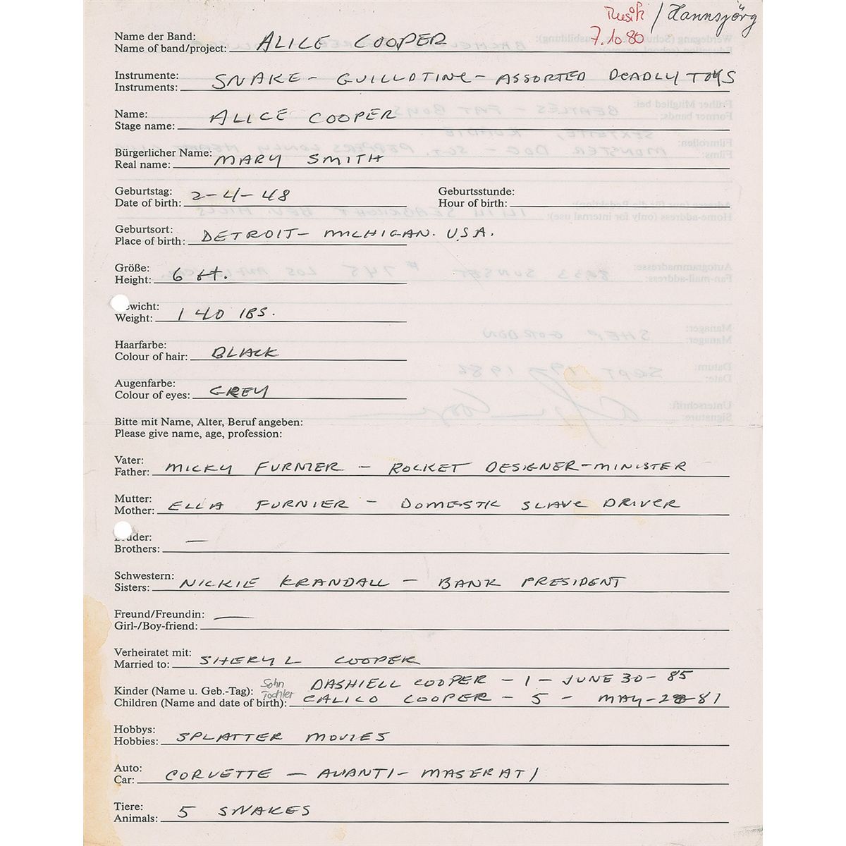 DS, one page both sides, 8.25 x 11.5, September 19, 1986. Customs form for entry into Germany, filled out entirely by Cooper. He prints the name of his band, “Alice Cooper,” and on the line asking about his instruments, he writes, “Snake—Guillotine—Assorted Deadly Toys.” He continues, adding his physical description and family history, listing his hobby as “splatter movies,” has “5 snakes” as animals, listing the three sports cars he owns, and former bands, “Beatles—Fat Boys.” At the conclusion he adds his home address, fan mail address, and signature. In fine condition, with expected document wear.