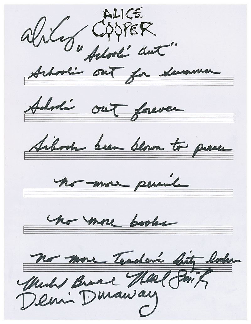 Handwritten souvenir lyrics to the chorus of ‘School’s Out,’ written out by co-writer Michael Bruce, on a white 8.5 x 11 sheet of musical manuscript paper, signed at the top in black felt tip by Alice Cooper and at the bottom by Dennis Dunaway, Neal Smith, and Michael Bruce. In fine condition.