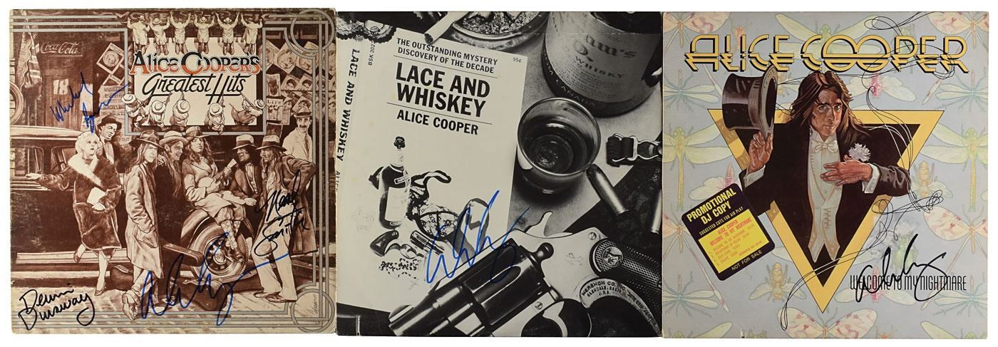 Three albums: Welcome to My Nightmare and Lace and Whiskey, both signed on the front cover in felt tip by Alice Cooper; and Alice Cooper’s Greatest Hits, signed on the front cover in felt tip by Cooper, Dennis Dunaway, Michael Bruce, and Neal Smith. In overall fine condition. The Greatest Hits record is not included. Consignor notes that all of the signatures were obtained in person.
