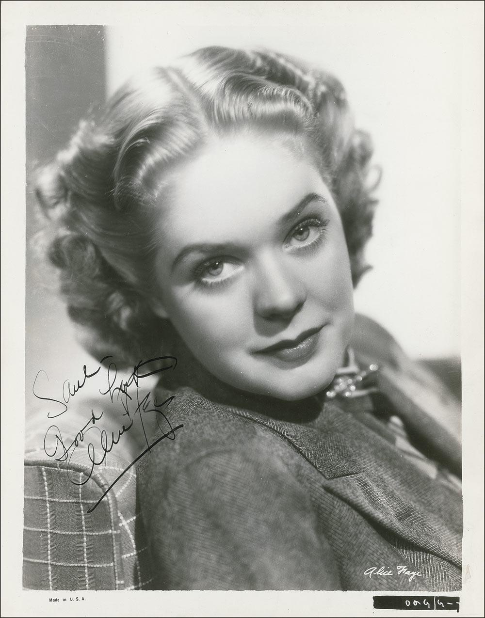 Engaging vintage glossy 8 x 10 photo, signed and inscribed in-person in fountain pen “Saul—Good Luck, Alice Faye.” Reverse of photo bears collector’s ink date notation of October 14, 1943, the date the signature was acquired. In fine condition, with light surface creasing and small surface tear to lower right border. Saul Goodman Collection.