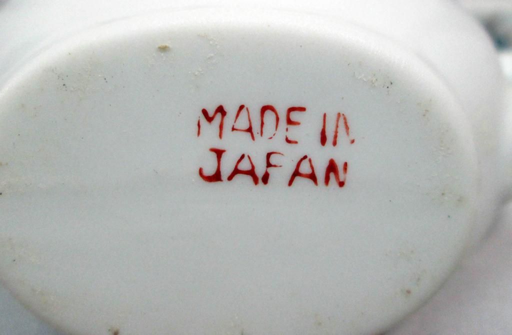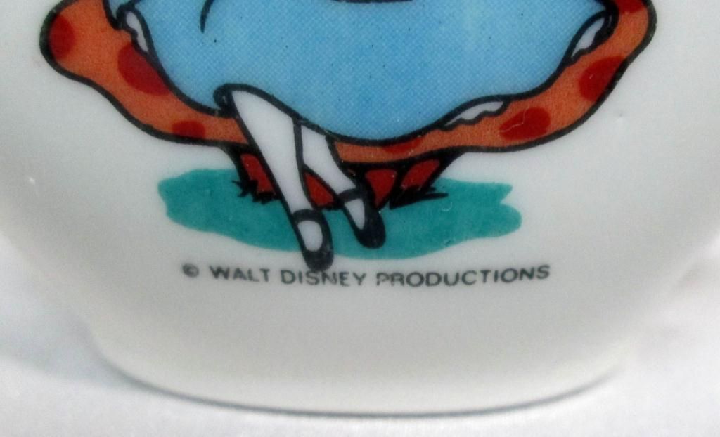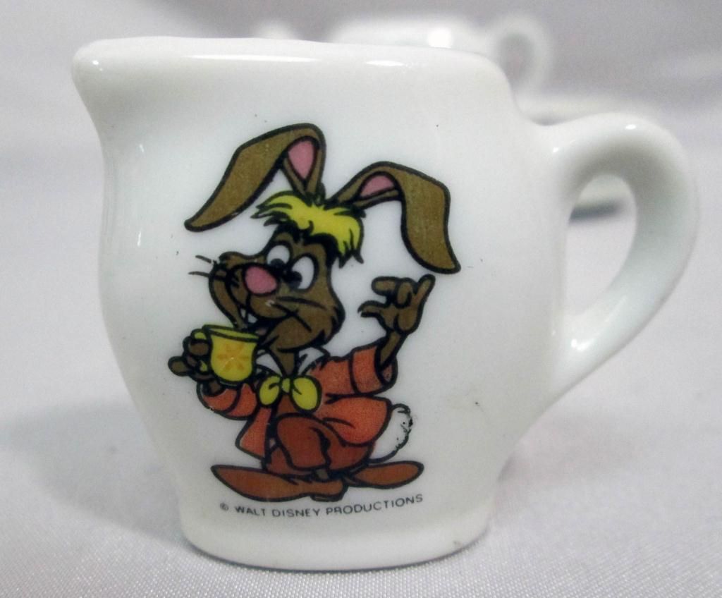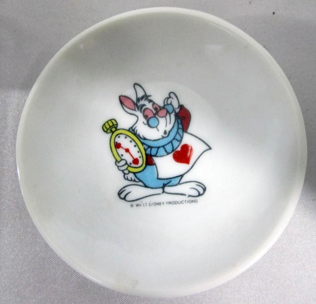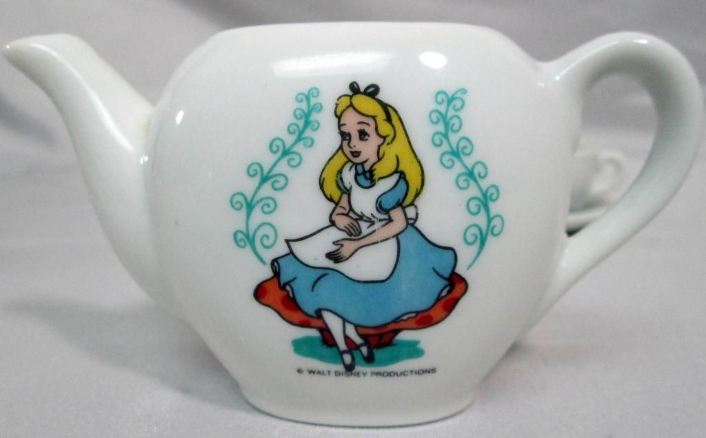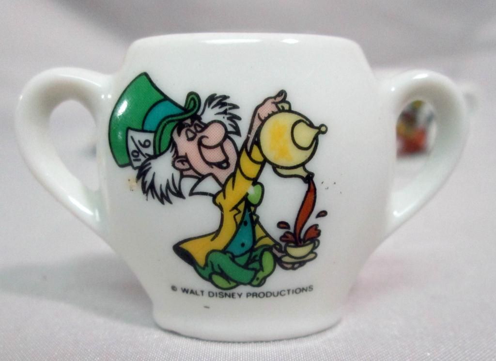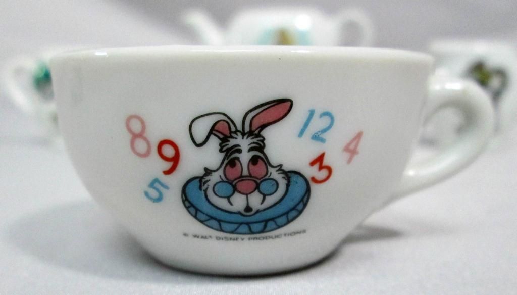 Walt Disney's Alice In Wonderland Toy China Tea Set. This set has 3 cups, 3 saucers, a tea pot, a sugar bowl and a creamer. There are no lids. We believe this set was sold late 1960s-1970s. Pieces are marked "Walt Disney Productions" and "Made in Japan" on bottom. Tea cups are 1 inch high and saucers are approx. 2 3/4 inches across. Tea pot is approx. 2 1/4 inches high and 4 inches across.