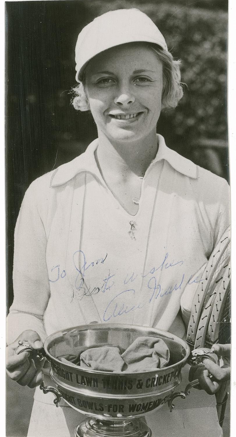 International Tennis Hall of Famer (1913-1990) who won 18 Grand Slam championships. Vintage glossy 4 x 8 photo of Marble holding a championship cup, later signed and inscribed in blue ballpoint “To Jim, Best Wishes, Alice Marble.” News service credit stamping on the reverse. In very good condition, with scattered creasing, scratches, streaking to the emulsion, rippling, tiny tear to the right edge, and trimmed edges.