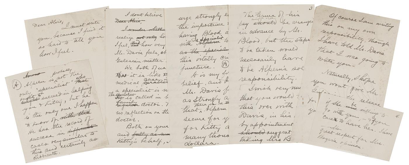 Pioneering American feminist (1857–1950) whose Woman’s Journal provided one of the most powerful and influential platforms of of the suffrage movement. Autograph letter, on six off-white sheets, five measuring approximately 5 x 8, with two smaller pages. A draft letter, most likely to Alice P. Tapley concerning Kitty Barry Blackwell. Blackwell has crossed out some of the words, which reads in part: “I wonder whether you realize how strongly Mr. Davis feels, about the Gulesian matter. We both of us think it is like a medical case in which a specialist is needed. The specialist is called in by the family doctor. That is no reflection on the family doctor. Both on your behalf, and on Kitty’s behalf, I cannot urge strongly enough the importance of your having Blood arrange with a specialist to act at this vitally critical juncture. It is my firm belief, and I know Mr. Davis feels as strongly as I do, that there is a strong probability that Alpern could secure for you & for Kitty a good many thousands of dollars. The terms of his pay might well be arranged in advance by Mr. Blood, but the steps to be taken would necessarily have to be Alpern’s sole responsibility. I wish very much that you would talk this over with Mr. Davis, in his office, by appointment …” In fine condition, with mild overall toning and some scattered light foxing.