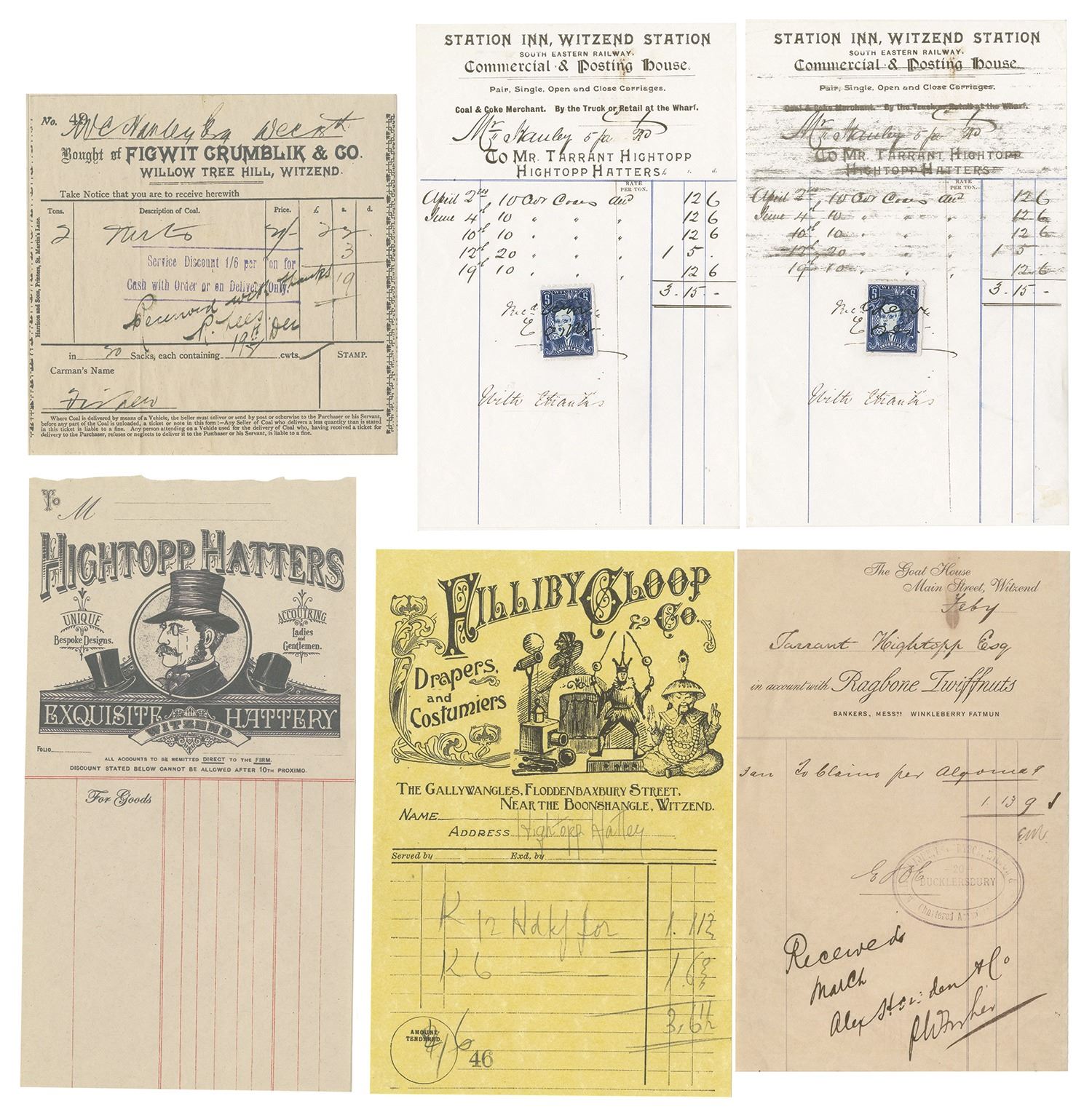 (Disney, 2016) A collection of (25) prop receipts and documents used in the feature film, Alice Through the Looking Glass. Five of the receipts feature custom created stamps depicting the Red Queen that are unique to the film. The collection also features receipts from various businesses from the world of Alice, such as Hightopp Hatters, Figwit Grumblik & Co, Filliby Gloop & Co, and Witzend Station. The papers measure between 5.5"x6" and 9.5"x5" and are all in good condition overall with minor wear from use.