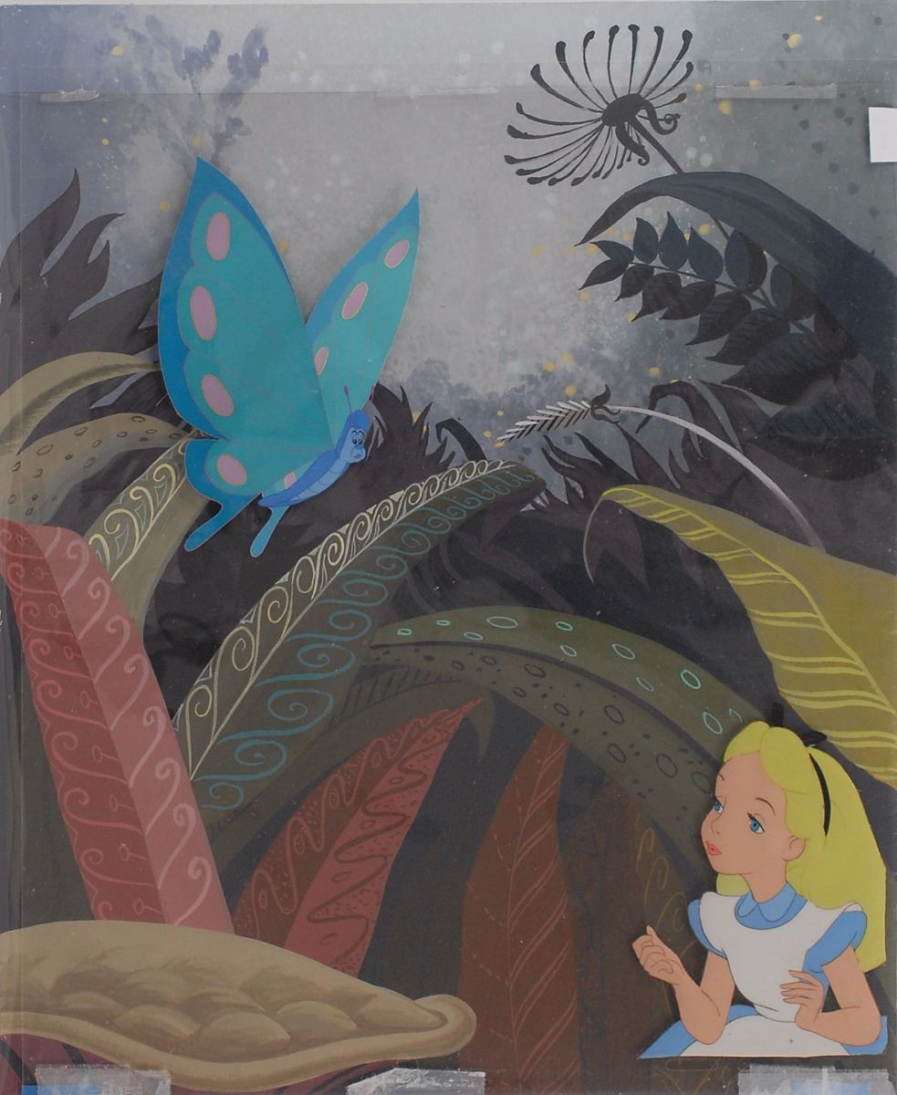 (Walt Disney Studios, 1951) Original production cels featuring Alice and the Butterfly from Alice in Wonderland, showing the post-transformation hookah-smoking caterpillar taking flight. The cels are applied to a hand-painted background. Character images measure 3.25 x 5 and 3 x 4.25, with overall dimensions of 11.25 x 13.5. In fine condition, with trivial soiling and surface impressions.