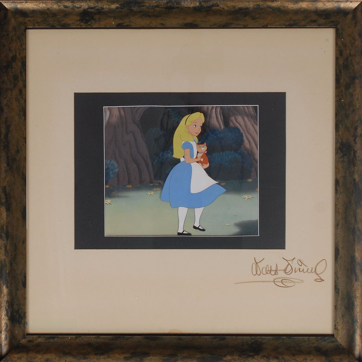 (Walt Disney Studios, 1951) Original production cel featuring Alice and Dinah from Alice in Wonderland. The cel is trimmed to image and placed on a color copy background. Image measures 4 x 8, with a mat opening of 9.75 x 8. The matted cel is placed in an original Courvoisier mat with appropriate penciled caption and encircled Walt Disney Productions “Original WDP” stamp below mat opening, signed in brown artist’s crayon by Disney, “Walt Disney.” This piece is also framed to an overall size of 23 x 23. In fine condition.