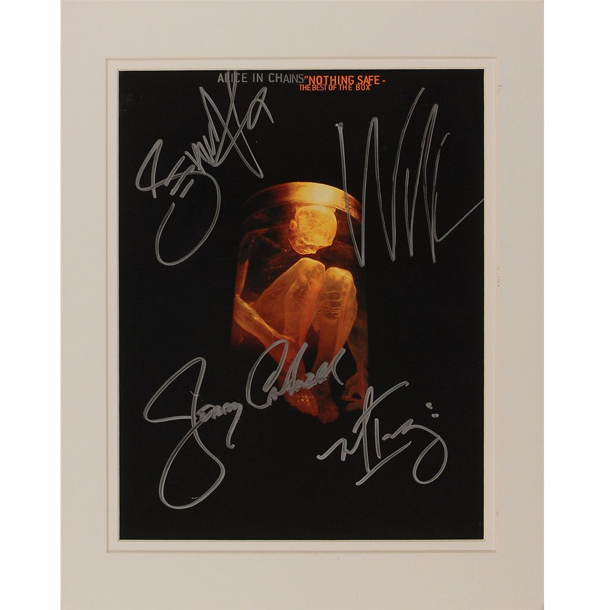 Color 8.25 x 10.75 program photo featuring their Nothing Safe album art, signed in silver ink by Jerry Cantrell, Sean Kinney, Mike Inez, and William DuVall. Matted to an overall size of 11 x 14. In fine condition, with a few light surface creases.