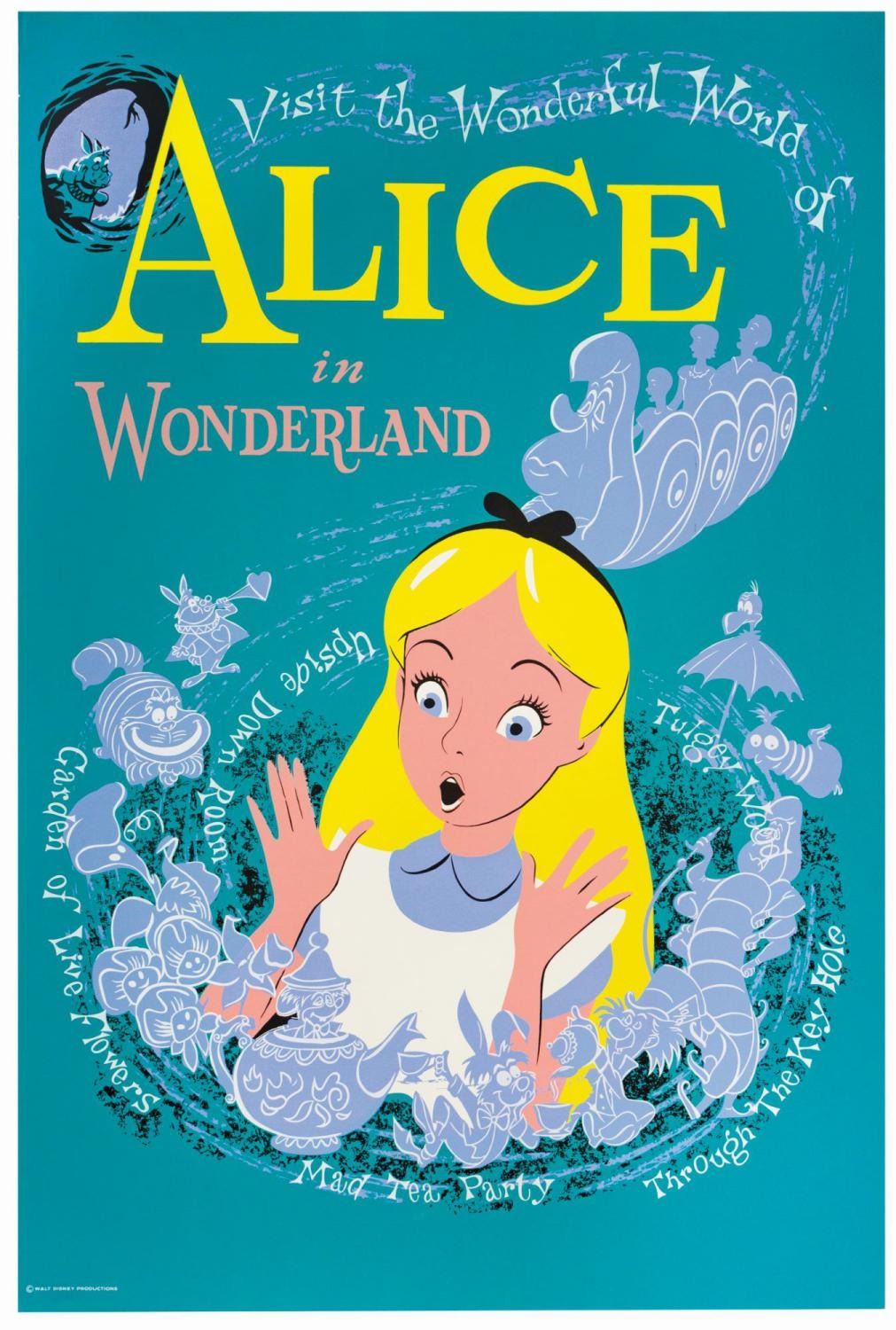 An original hand-silkscreened poster for the Alice in Wonderland attraction at Disneyland. Designed by Imagineer Sam McKim, the poster features the popular image of Alice down the rabbit hole with the denizens of Wonderland. Measuring 54"x36", the piece is in fine condition with minor edge wear, corner bends, faint surface impressions, and spot surface wear.