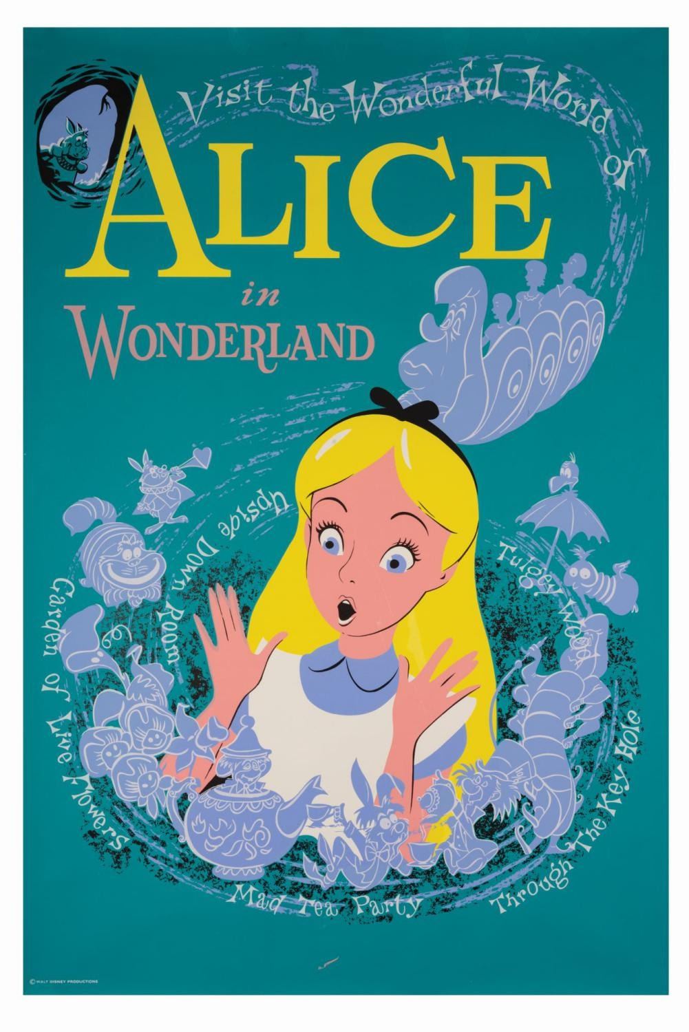 (Disneyland, 1958) An original hand-silkscreened poster for the Alice in Wonderland attraction at Disneyland. Designed by Imagineer Sam McKim, the poster features the popular image of Alice down the rabbit hole with the denizens of Wonderland. Measuring 54"x36", the piece is in very good condition with minor edge wear, including a couple of small tears. There are several printing errors, including some smearing to the ink on Alice's face and uneven color application along the top edge.