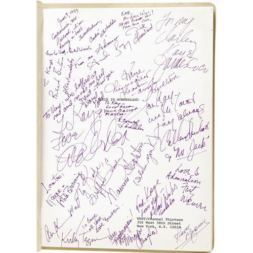 <B>"Alice in Wonderland" Cast-Signed Script.</B></I> Kaye Ballard's copy of the script for WNET's 1983 production of <I>Alice in Wonderland,</B></I> originally broadcast as an episode of <I>Great Performances,</B></I> signed by cast members Richard Burton (it was one of his last performances), Maureen Stapleton, James Coco, and others. In Excellent condition with mild cover wear. <I>Accompanied by LOA from PSA/DNA.</B></I><BR><BR><b>Shipping:</b> Books & Catalogs (<a target="_blank" href="http://www.heritageauctions.com/common/shipping.php">view shipping information</a>)