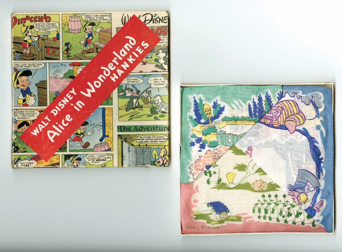 (c. 1951) Walt Disney Alice in Wonderland Hankies in original box. Box measures 7"x7". In good condition.