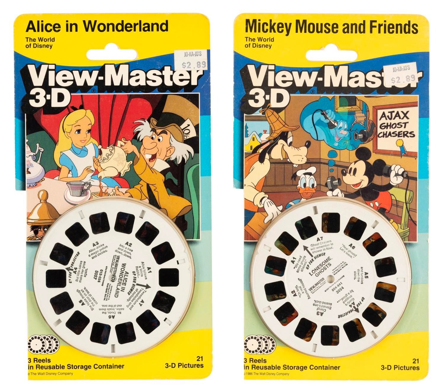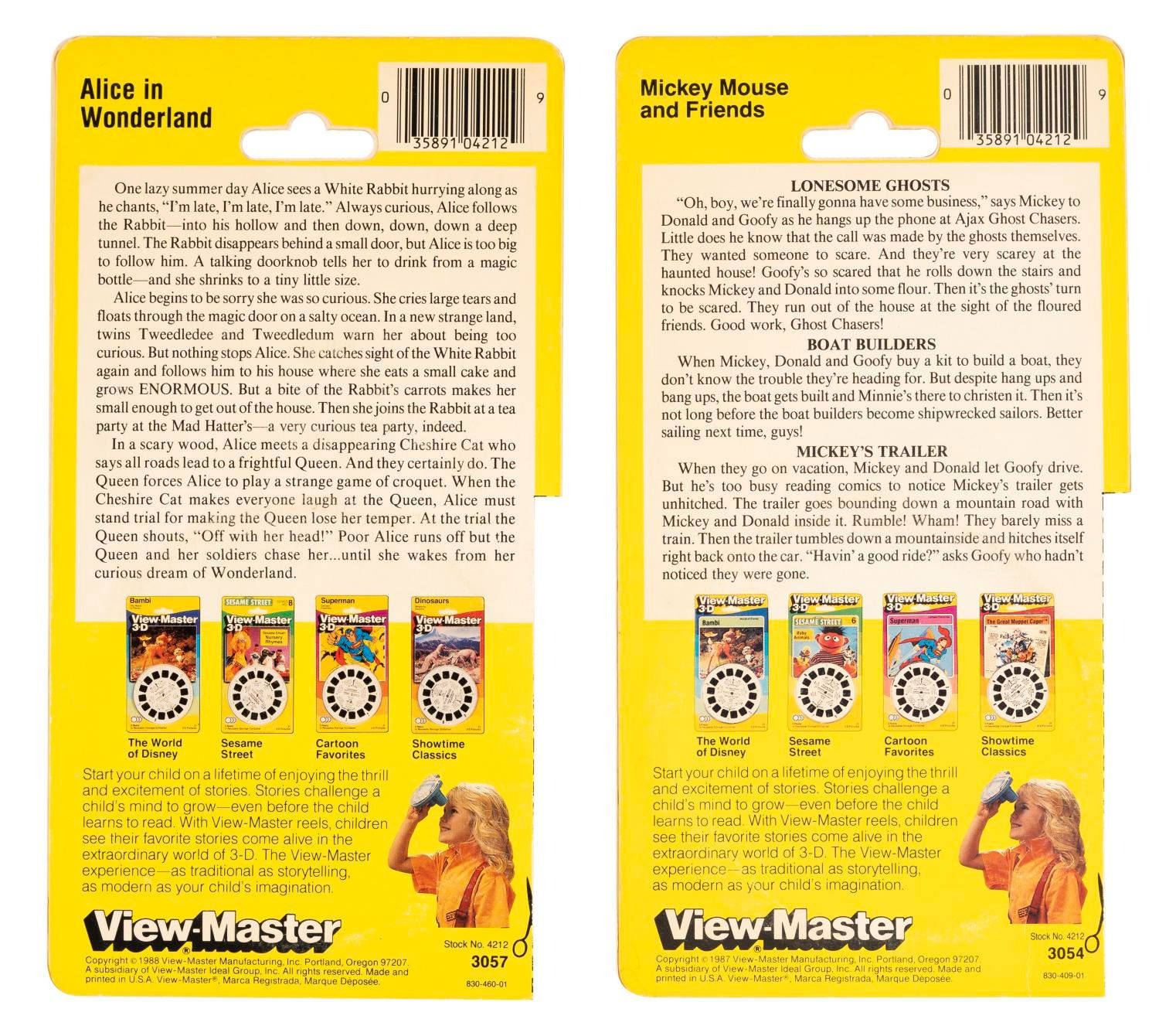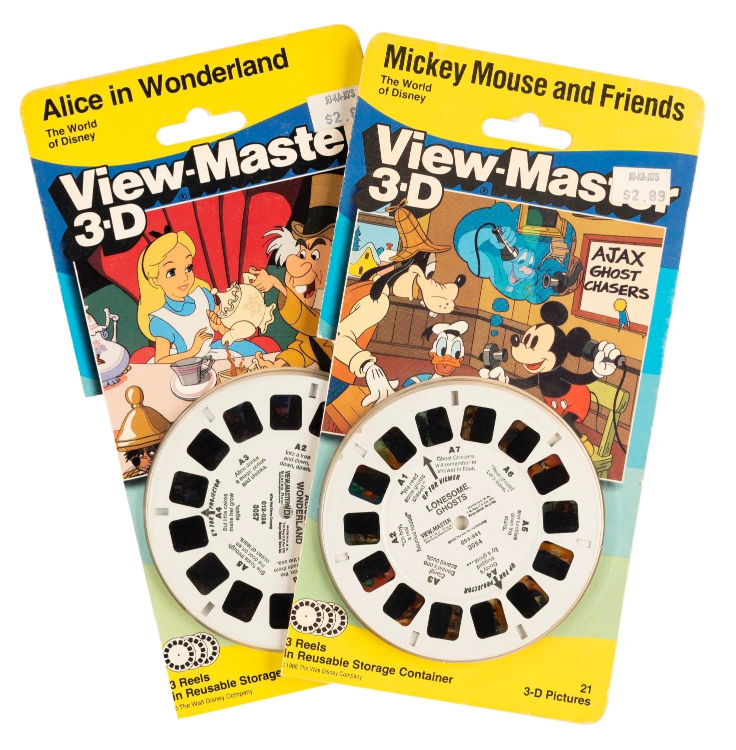 (Disney, 1986-1988) A pair of View-Master 3-D reels for “Alice in Wonderland” and Mickey Mouse and Friends in “Lonesome Ghosts.” Measuring 3.5” in diameter and 4.5” x 8.5” in their original packaging, the reels are in fine condition, while both packages have a 4.25” section cut off on the bottom left side.