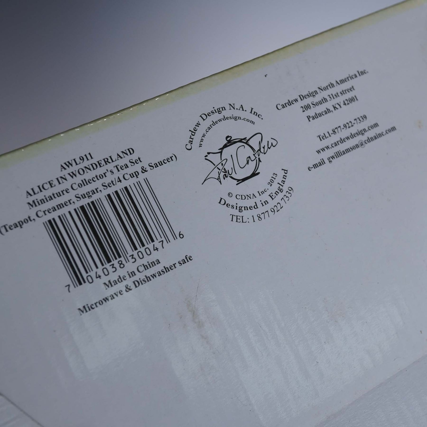 This whimsical porcelain tea set celebrates the 150th Anniversary of Alice in Wonderland with delightful illustrations by Paul Cardew. The set features beloved characters from Lewis Carroll's tale including the Mad Hatter, March Hare, Cheshire Cat, and Alice herself, each beautifully rendered on the miniature teapot, sugar bowl, creamer, and four matching cups with saucers. Each piece is marked on the bottom: Alice in Wonderland 150th Anniversary, Paul Cardew Design. Ranging from approximately 1"H to 3"H, the set is ideal for collectors or fans of the fantastical classic. Includes the original illustrated display box measuring 8.5"L x 8.5"H.
