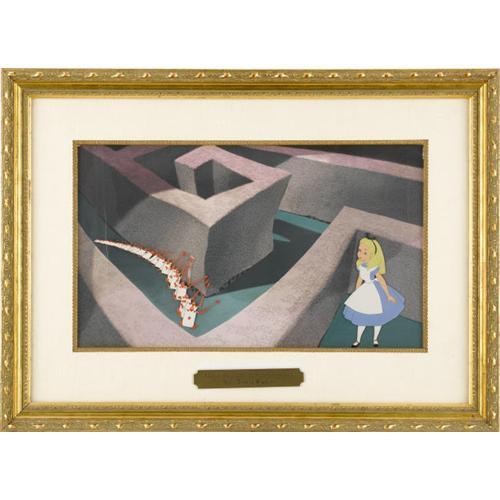 <B>"Alice in Wonderland" Production Cel with Production Pan Background Original Art (Walt Disney, 1951).</B></I> Pretty Alice is trapped in a maze with the playing card soldiers, in this original production cel, matched with a detailed production "pan" background. This piece will make a terrific showpiece for any Walt Disney aficionado! Image area of 19" x 11". Framed, and in Excellent condition.