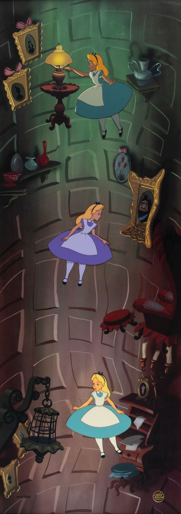 (Walt Disney Studios, 1995) Original limited edition hand-painted cel entitled 'Down the Rabbit Hole,' numbered 407/500, showing Alice drifting down the White Rabbit's whimsical tunnel. The cel is placed on its matching Disney litho background. Each image measures about 4 x 5, with a mat opening of 11 x 31. Framed to an overall size of 21 x 41. The piece has the silver Walt Disney Company seal to lower right. In fine condition. Accompanied by a certificate of authenticity from The Walt Disney Company.