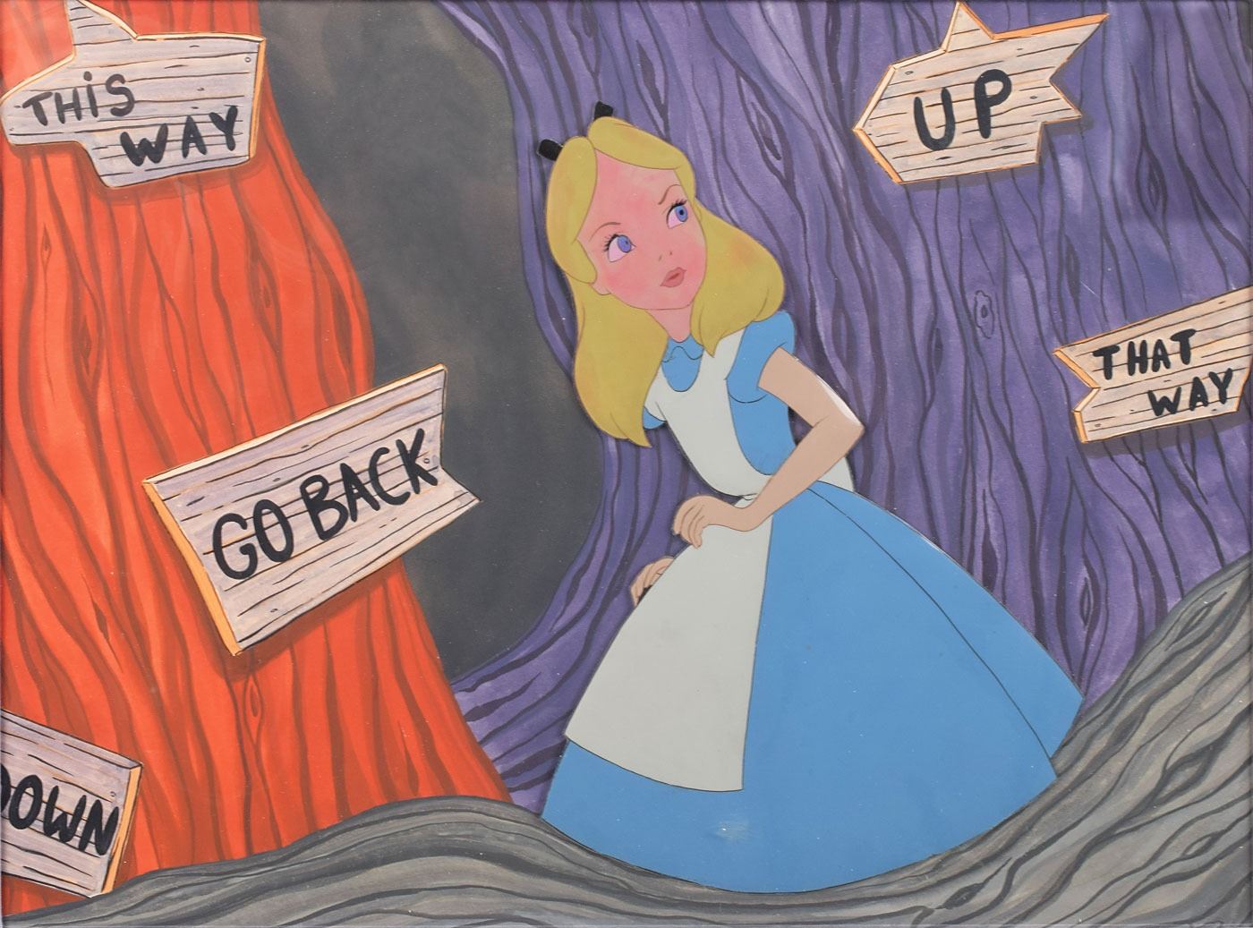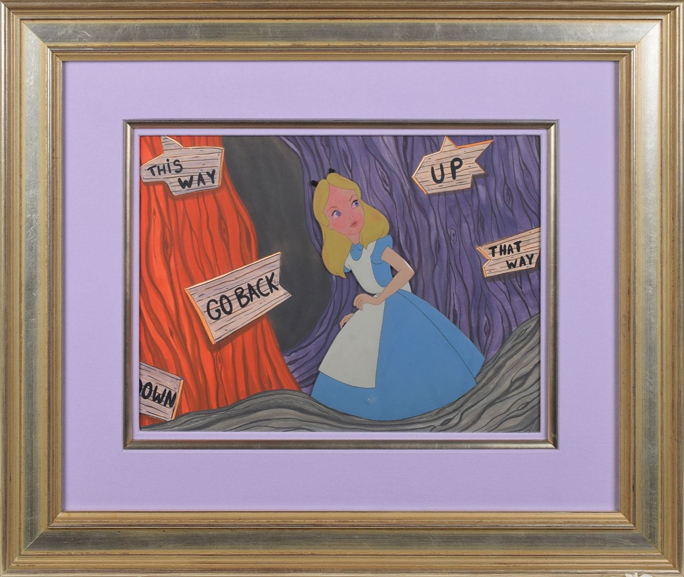 (Walt Disney Studios, 1951) Original production cel featuring Alice from Alice in Wonderland, showing her in her iconic blue dress as she descends into the ominous Tulgey Wood. The cel is placed on a hand-painted custom prepared background depicting Tulgey Wood, painted circa 1990s. Image measures 6 x 8, with a mat opening of 13 x 10. Handsomely double-cloth-matted and framed to an overall size of 22.5 x 19. In fine condition. A simply stunning piece.