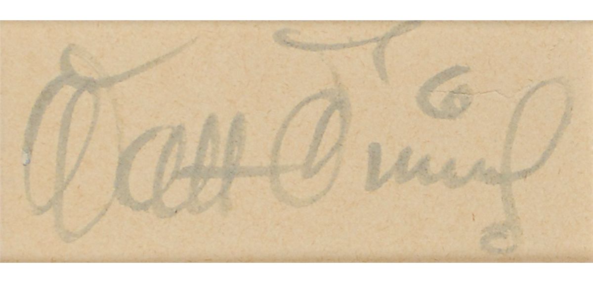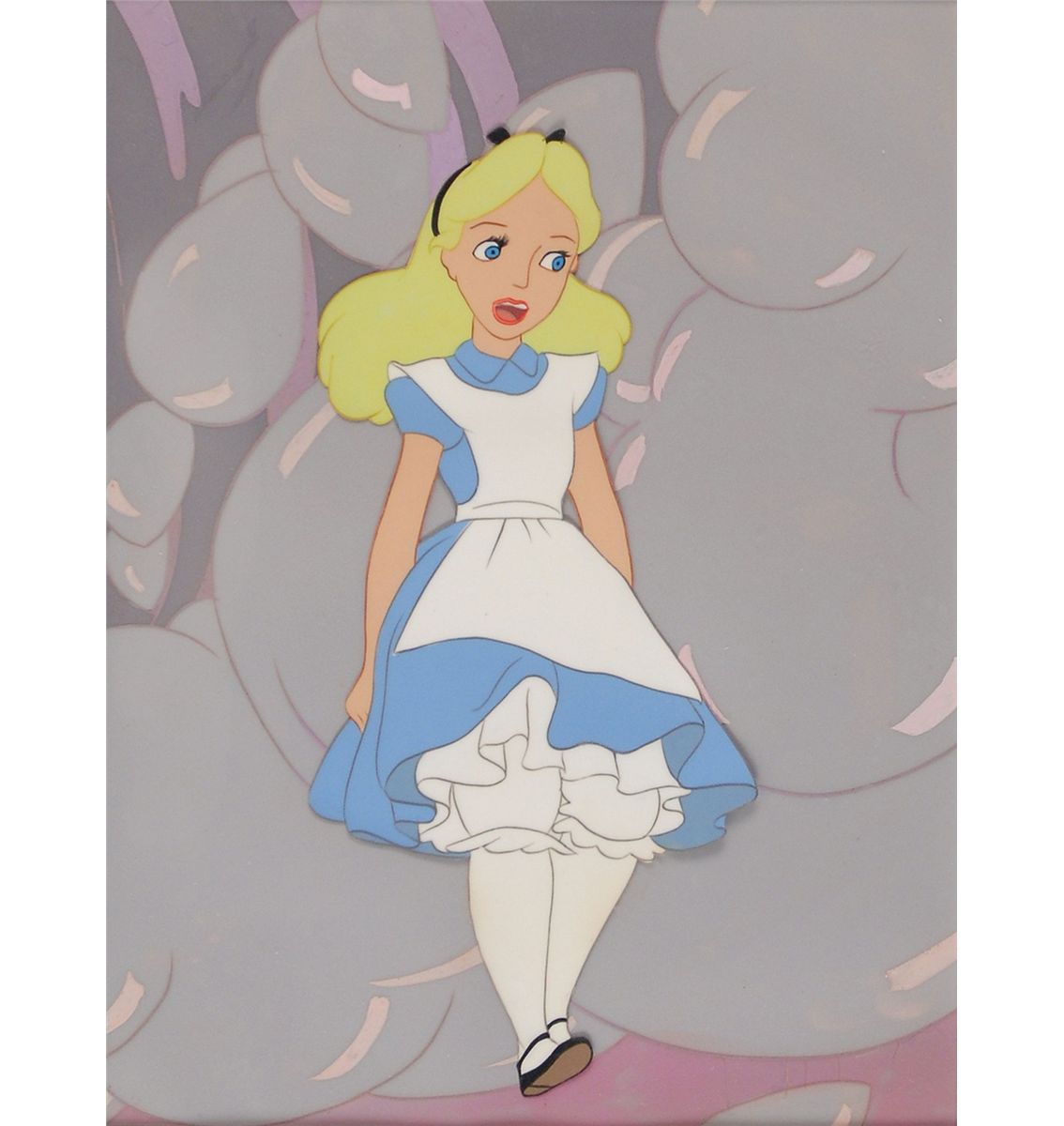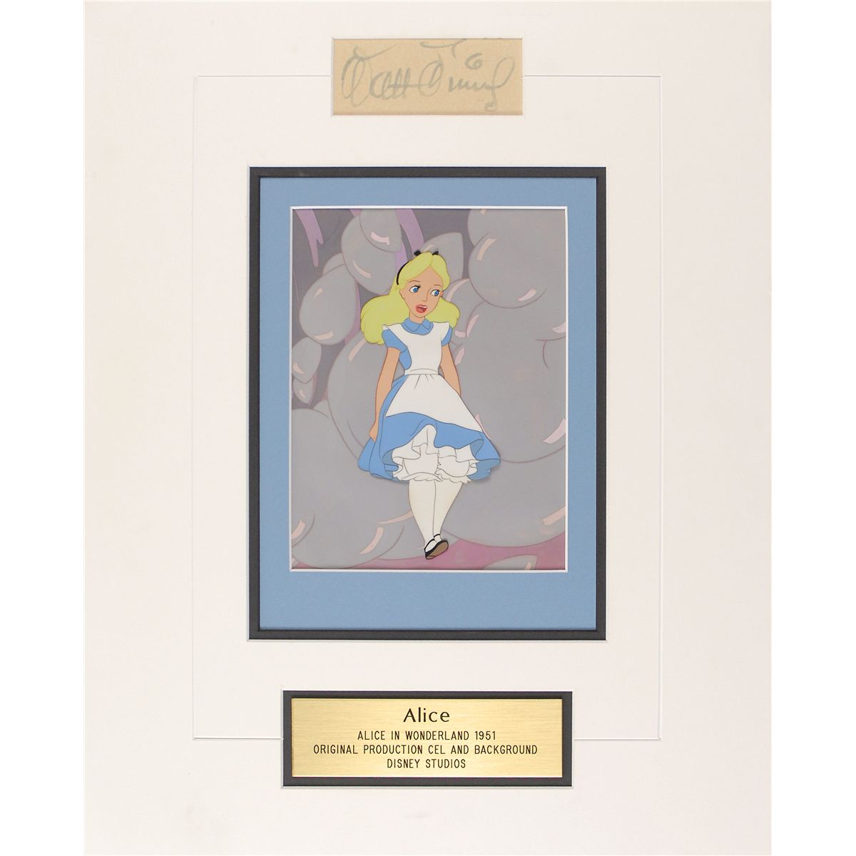 (Walt Disney Studios, 1951) An attractive ink signature, “Walt Disney,” on a 3.75 x 1.5 slip, with a rare original pair of production cels on a production background featuring Alice from Alice in Wonderland. The cel is placed on a hand-painted production background. Image measures 3 x 6, with a mat opening of 5.25 x 7. Matted together with dimensions of 15.5 x 16.75. In fine condition.