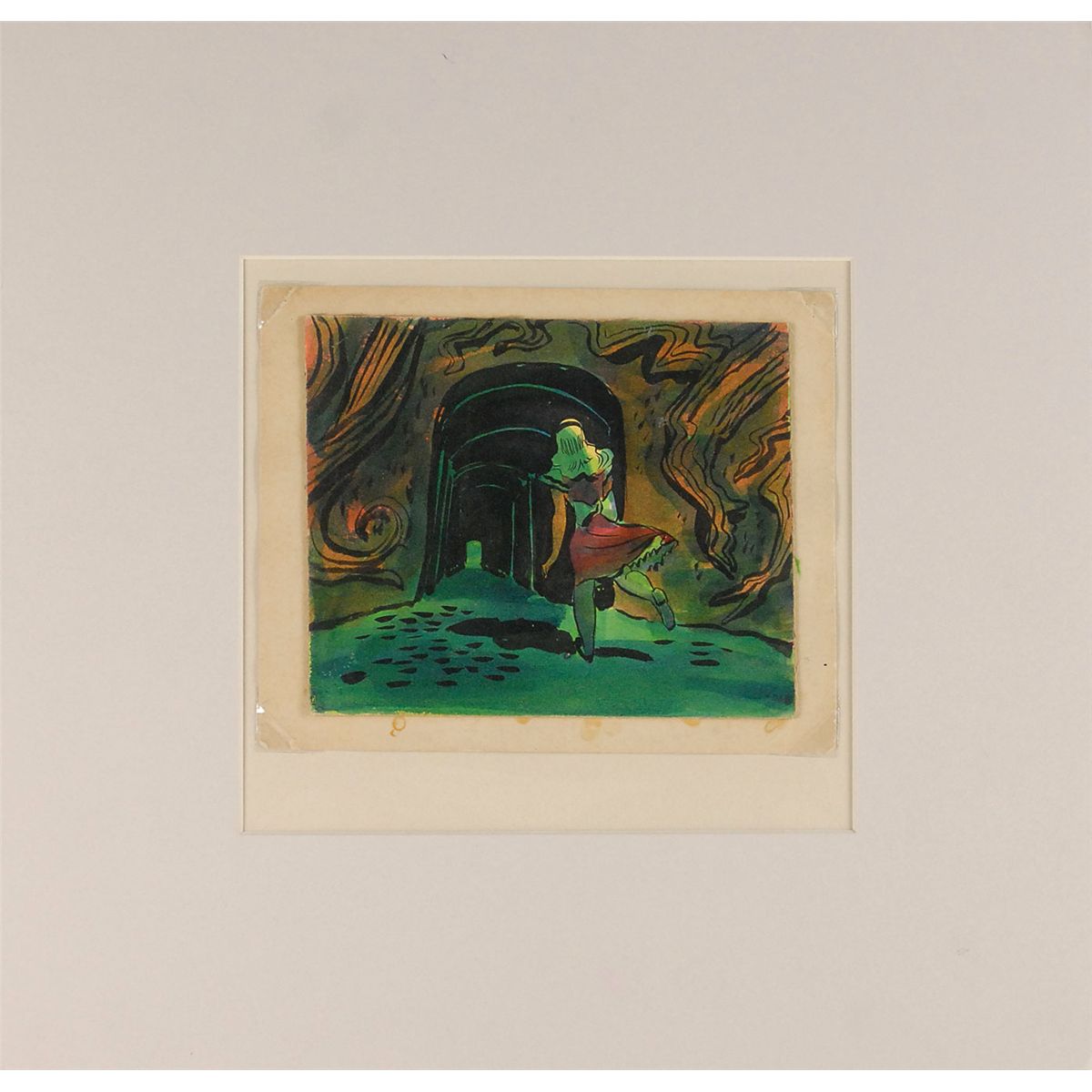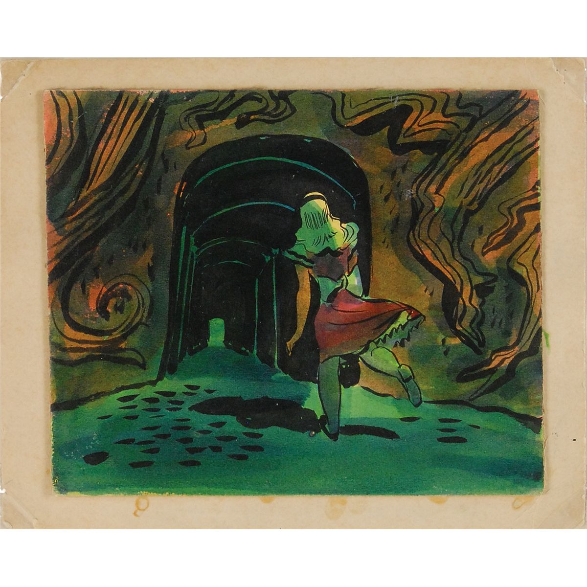 (Walt Disney Studios, 1951) Original water color concept storyboard by David Hall featuring Alice from Alice in Wonderland, watercolor on a 6 x 4.75 board affixed to a 7 x 6 sheet. Artwork shows Alice running down the long hallway of the rabbit hole. Mat dimensions are 13.75 x 13.25. In fine condition. After the enormous success of Snow White in 1937, Walt Disney was working on an idea to bring Alice to the big screen. He hired Hall, who produced over 400 pieces of concept art for the film. Disney found Hall’s work on the dark side and stated it would be difficult to animate. Identifying the amount of time needed to make a proper film, and along with the economic fallout from World War II, the project was shelved for several years.