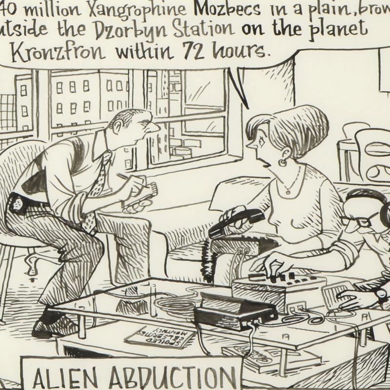Enter a surreal and satirical world of twisted imagination and award winning creativity. "Alien Abduction" is an original pen & ink drawing on paper by Dan Piraro, creator of the critically acclaimed and award winning comic strip, Bizarro. This piece is hand signed and comes framed. Includes Letter of Authenticity! Measures approx. 20.5" x 14.5" (frame), 13" x 7" (image).