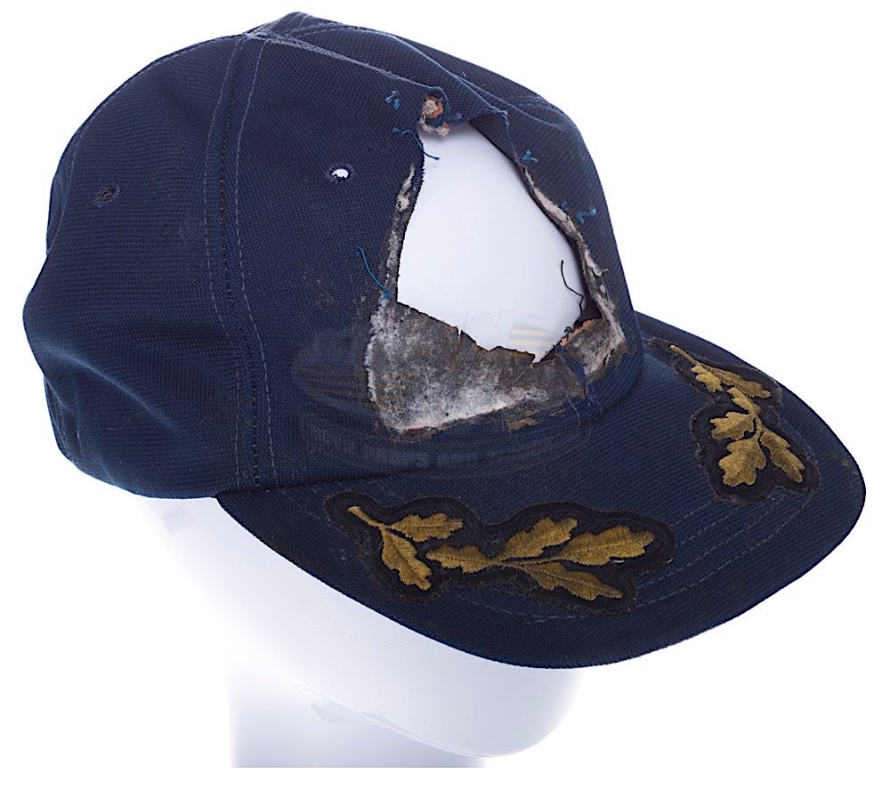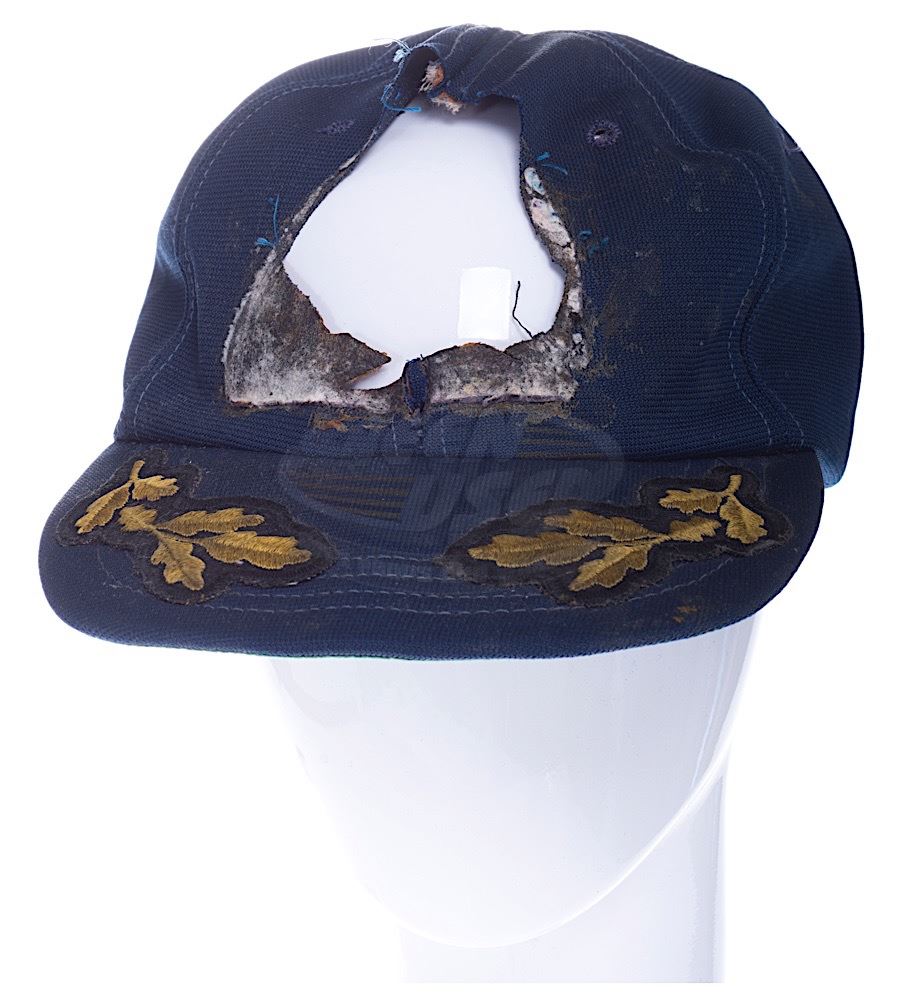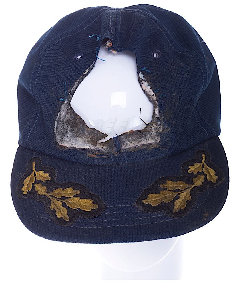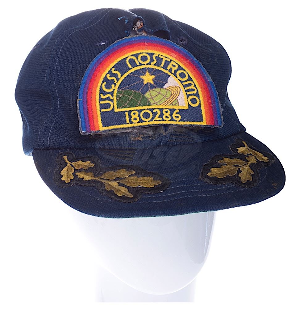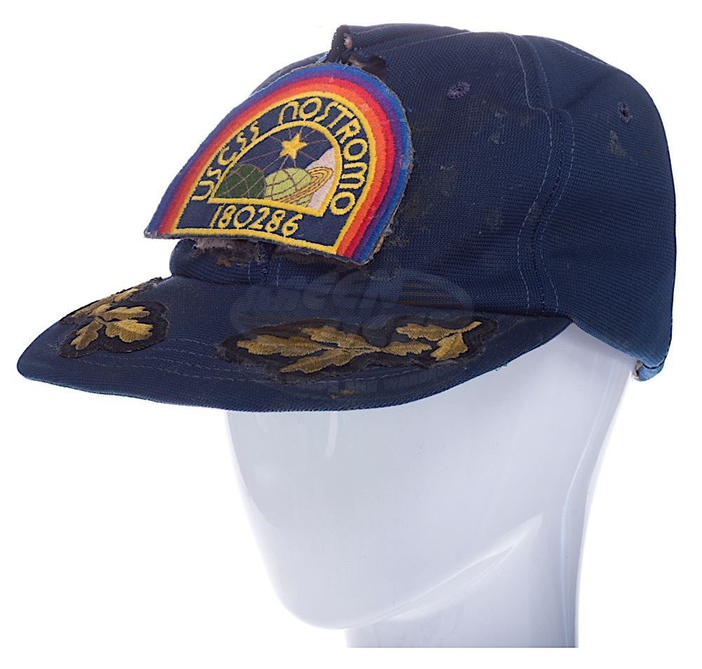 (20th Century Fox, 1979) This hat was acquired by the production and customized for use by Harry Dean Stanton as "Brett". The baseball style hat features unique distressing for use in Brett's "Death Scene". A section above the brim has been removed and distressed and was covered with what is believed to be a printed paper version of the "Nostromo" patch. This paper version of the patch was used, as it would easily collapse into the hat for the insert shot of the "Alien" inner jaw biting through the hat. This hat is similar to the one seen in the final cut of the film, but was a backup piece, and the production patch was received with it. In addition, the leaf-shaped embellishments (also known as "scrambled eggs") on the visor are slightly different.