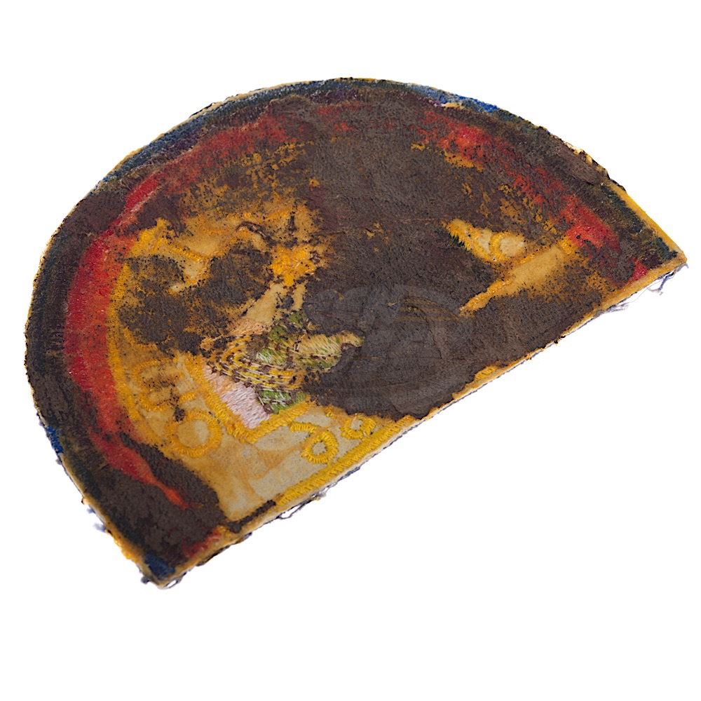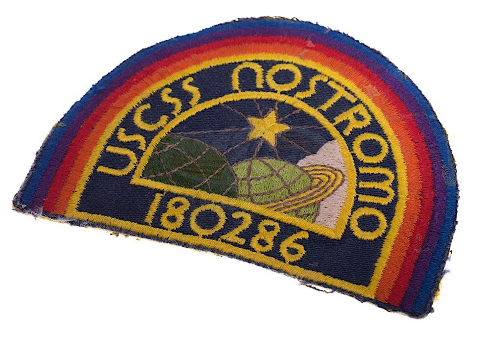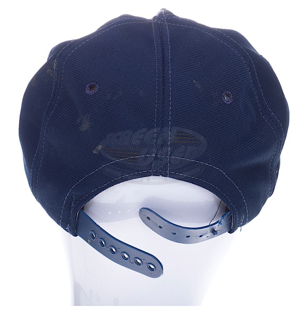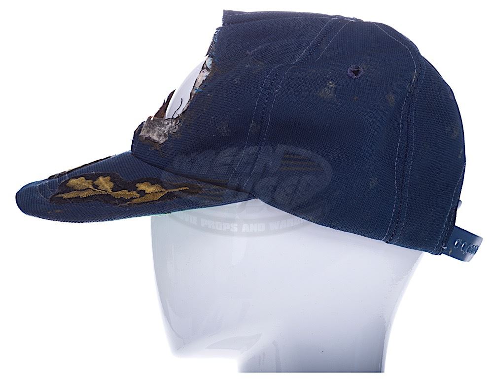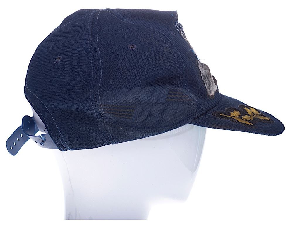 (20th Century Fox, 1979) This hat was acquired by the production and customized for use by Harry Dean Stanton as "Brett". The baseball style hat features unique distressing for use in Brett's "Death Scene". A section above the brim has been removed and distressed and was covered with what is believed to be a printed paper version of the "Nostromo" patch. This paper version of the patch was used, as it would easily collapse into the hat for the insert shot of the "Alien" inner jaw biting through the hat. This hat is similar to the one seen in the final cut of the film, but was a backup piece, and the production patch was received with it. In addition, the leaf-shaped embellishments (also known as "scrambled eggs") on the visor are slightly different.