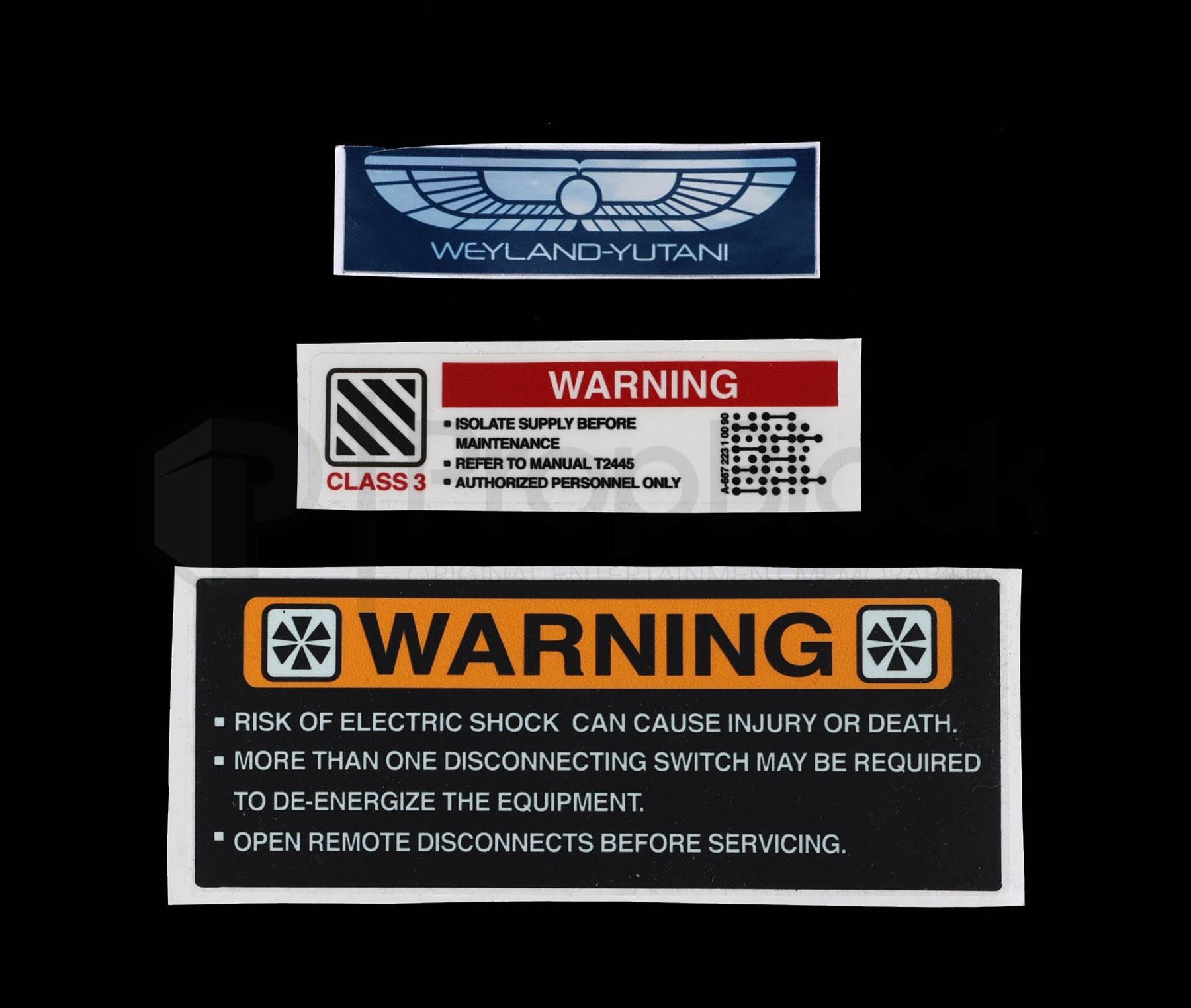 Original un-used decals made for use in the 2017 Ridley Scott horror film Alien: Covenant. Bound for a remote planet on the far side of the galaxy, members (Katherine Waterston, Billy Crudup) of the colony ship Covenant discover what they think to be an uncharted paradise. While there, they meet David (Michael Fassbender), the synthetic survivor of the doomed Prometheus expedition. The mysterious world soon turns dark and dangerous when a hostile alien life-form forces the crew into a deadly fight for survival. This set features three decals that were created for use aboard the Covenant set. The first is a metallic blue and silver Weyland-Yutani logo and the second and third are "Warning" labels. This set remaisn un-used and in excellent, production made condition.