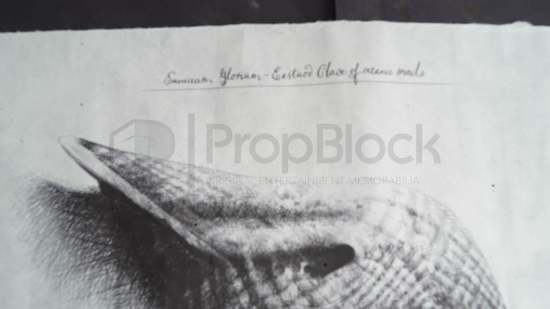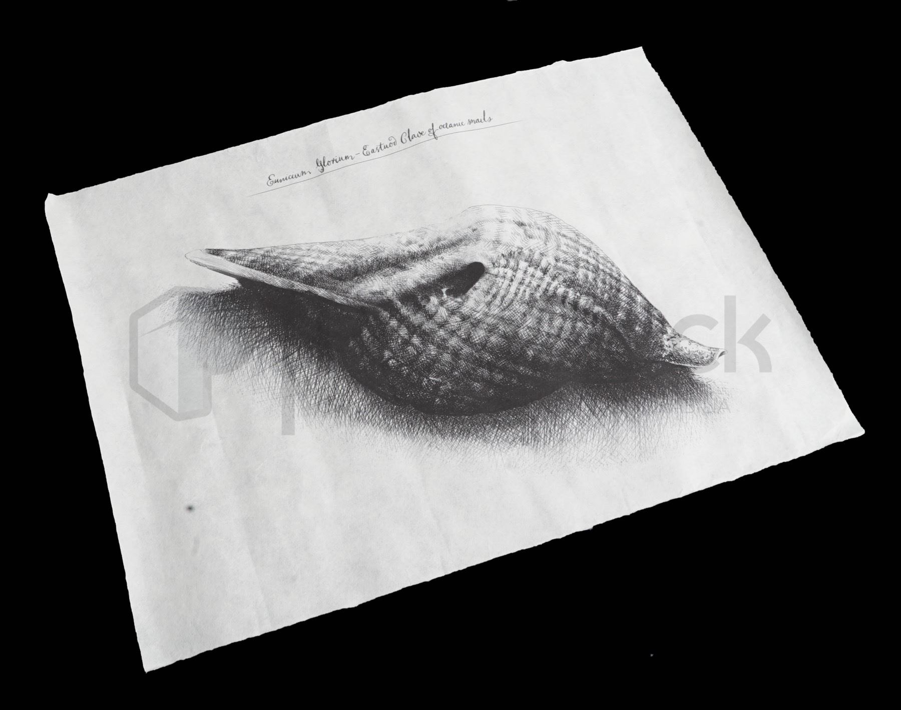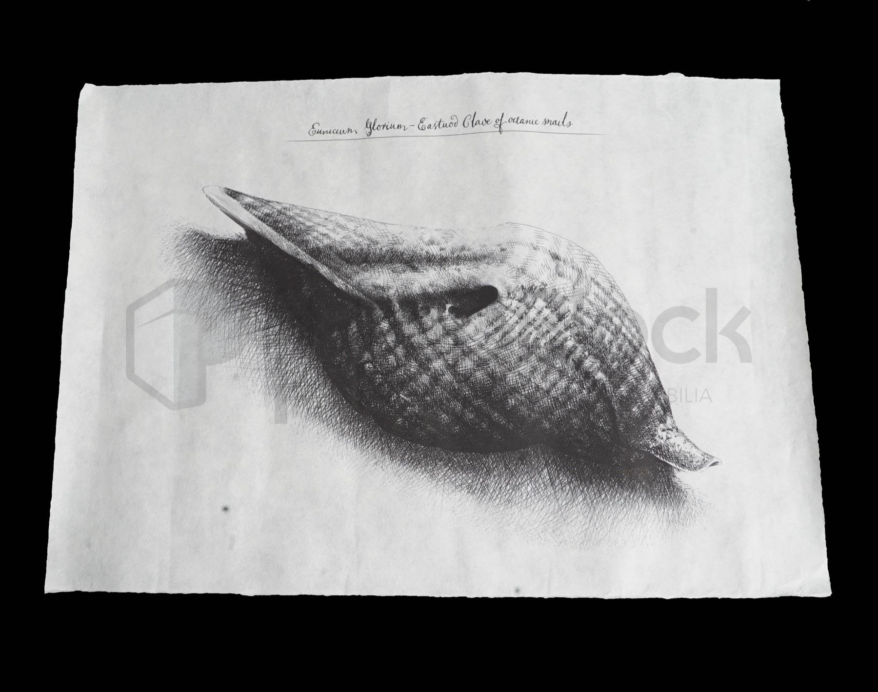 Production printed artwork featuring the image of an alien shell used in the Ridley Scott film Alien: Covenant. In the film the android David had been conducting experiments and there were many examples of artwork related to his research all over the cave area he was using as a lab. This piece of artwork features an alien type shell or pod. The artwork is printed on parchment paper and has torn edges, there are pin holes on the top corners and tape on the back.