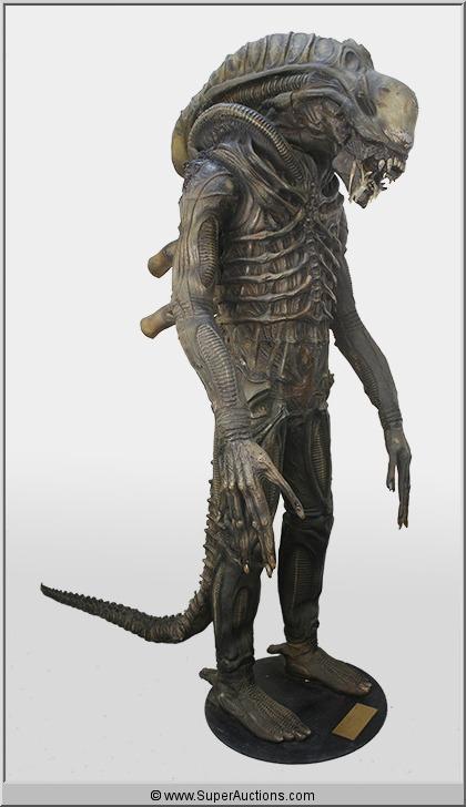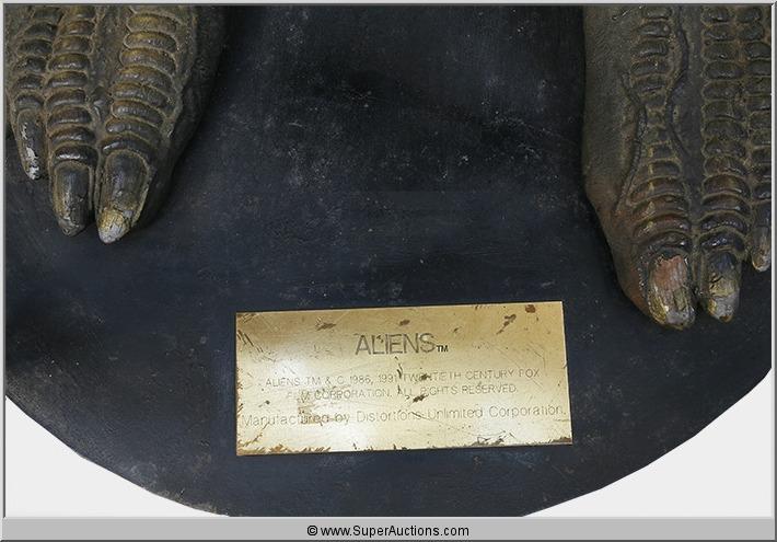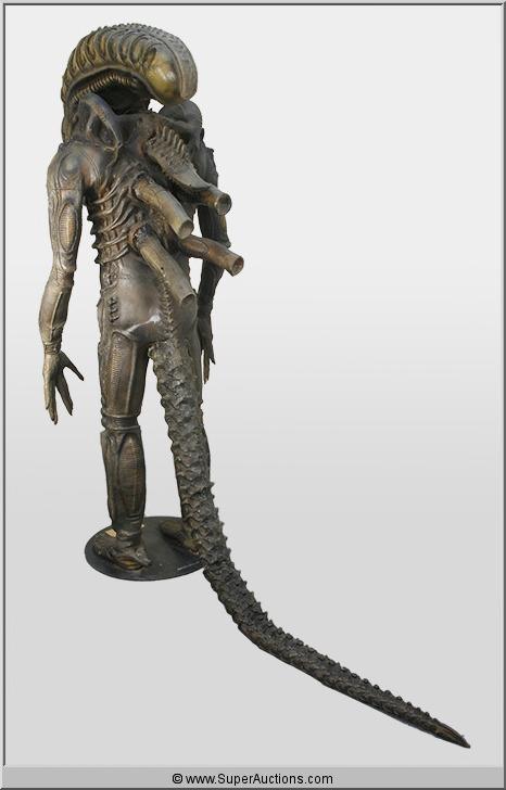 A full scale Replica of the Alien Creature from the popular Alien film series. Made of molded rubber in one piece with outstretched arms and a long ridged tail of foam. Approximately 89" high. The platform upon which the alien stands has a gold tag with information that it is trademarked and copyrighted 1986 and 1991 by 20th Century Fox Film Corporation.
