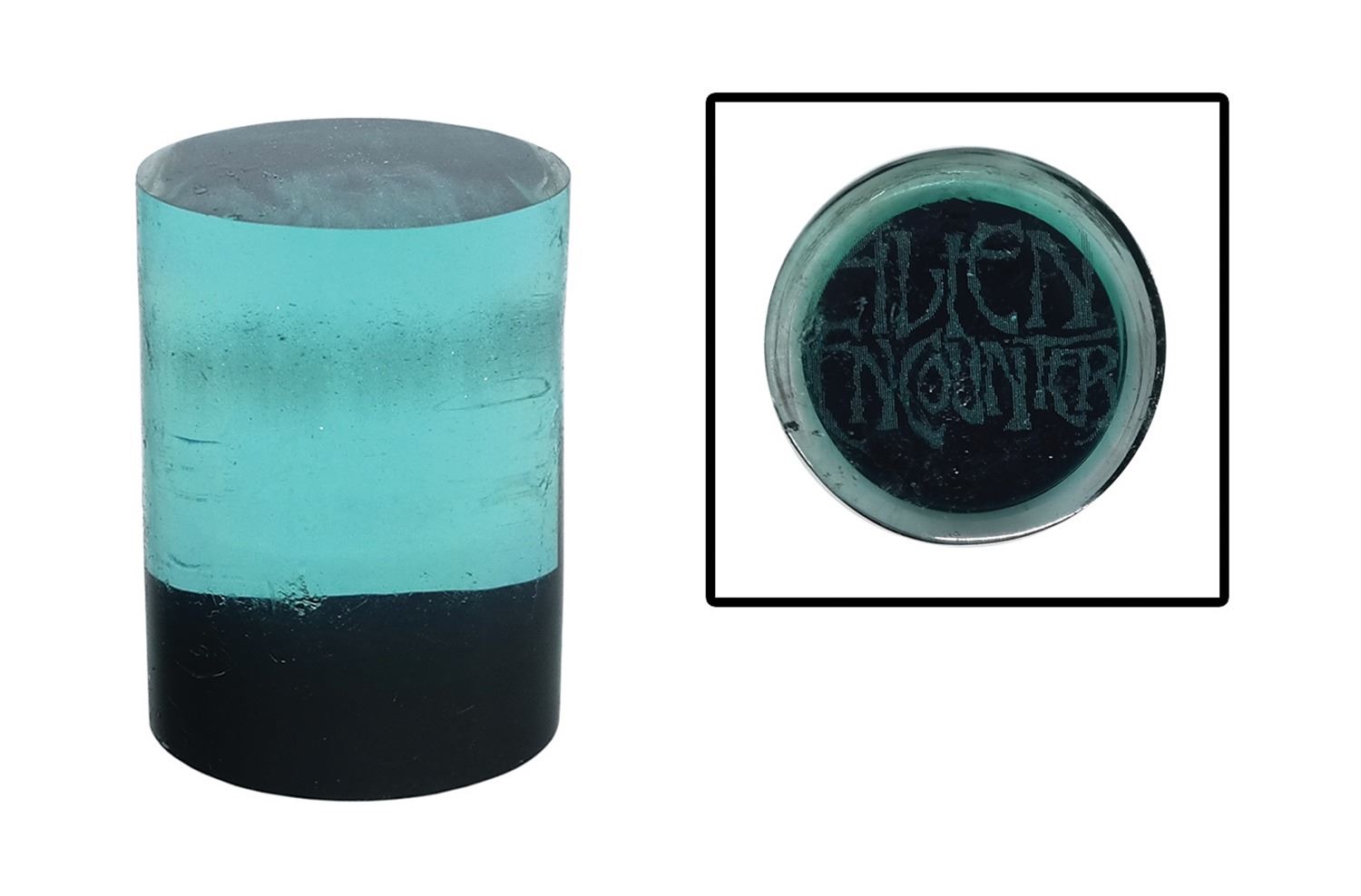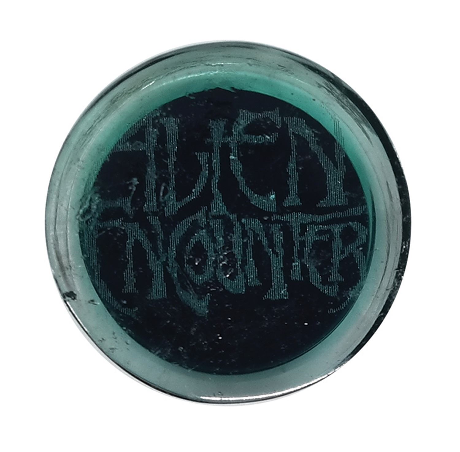 (Walt Disney World, c.1995) An original Lucite paper weight featuring the Alien Encounter logo. The paperweight was created as a gift to members of Imagineering who worked on the project, and this paperweight comes in its original brown box. Viewing the paperweight from the top reveals the attraction's logo. Measuring 2" in diameter by 2.75" tall, the Lucite is in very good condition overall with minor surface wear and scuffing to box.