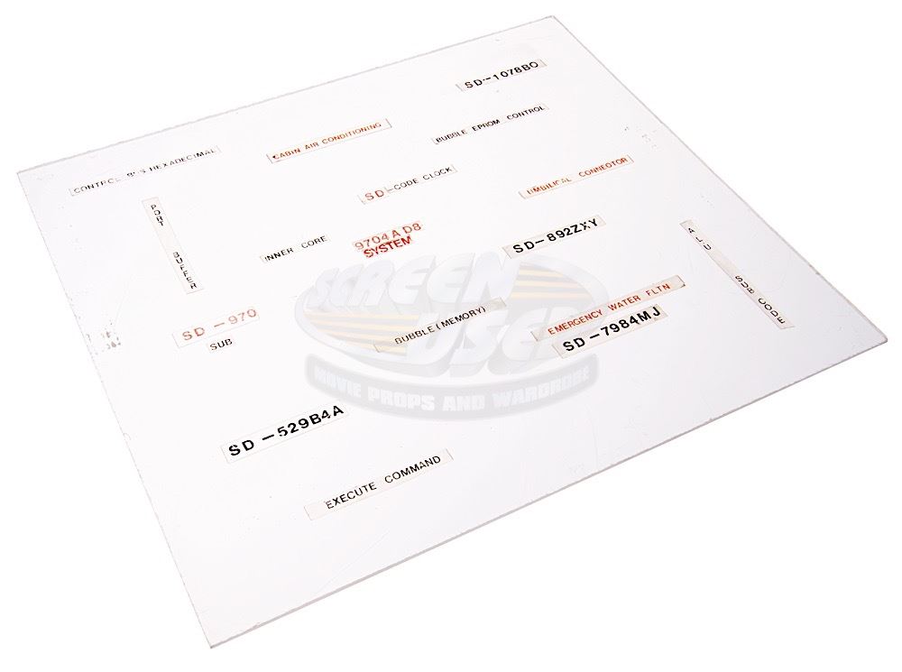 (20th Century Fox, 1979) This "Mother" computer room panel was acquired and customized by the production for use as set dressing. The panel is made of clear acrylic with applied information labels. This style panel is seen in front of the white wall panels as added detail. The panel measures 14.5" x 13" and has only minor wear from use and storage. A very rare artifact from the first film in the series.