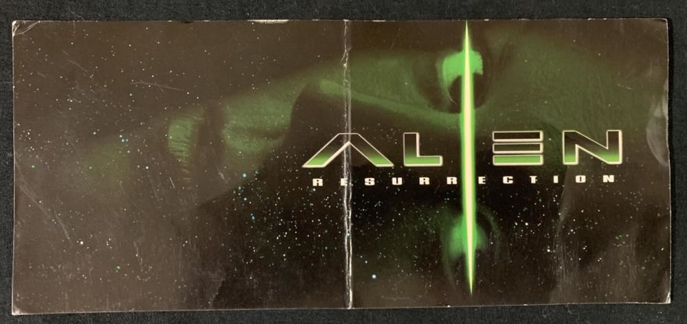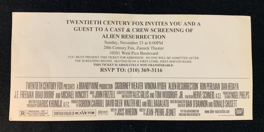 Original 20th Century Fox invitation for the cast and crew to a viewing of the Jean-Pierre Jeunet directed science fiction horror film "Alien Resurrection" (1997). 200 years after her death, Ellen Ripley is revived as a powerful human/alien hybrid clone. Along with a crew of space pirates, she must again battle the deadly aliens and stop them from reaching Earth.
