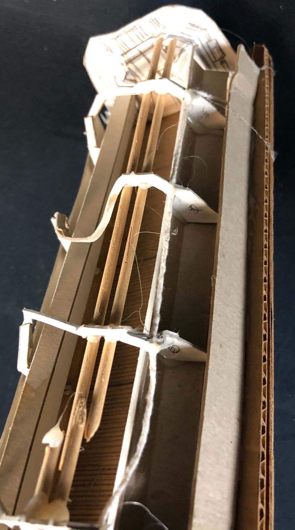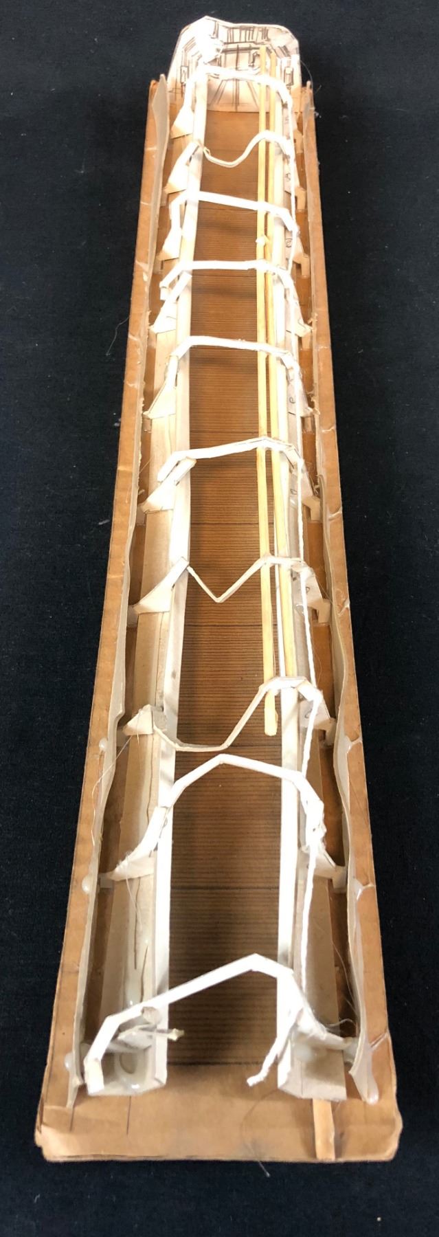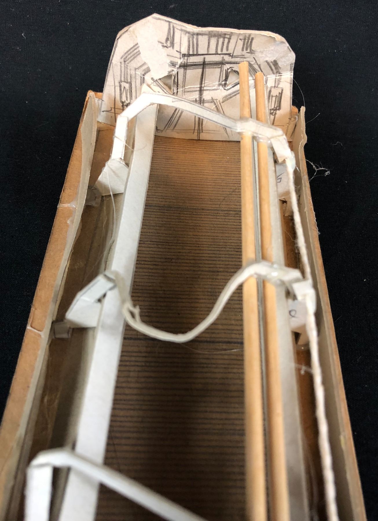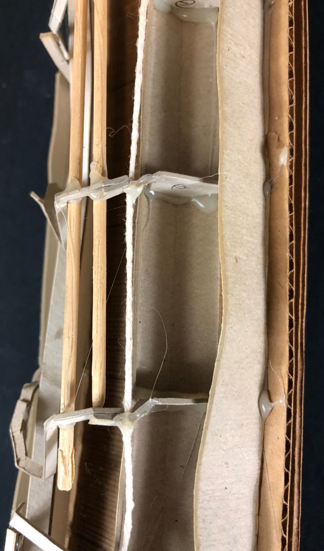 Made of cardboard with wooden dowel rods and string. Measures Approximately 3 feet.