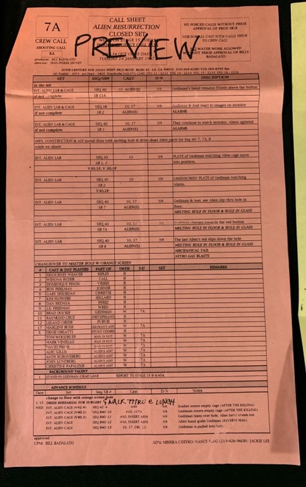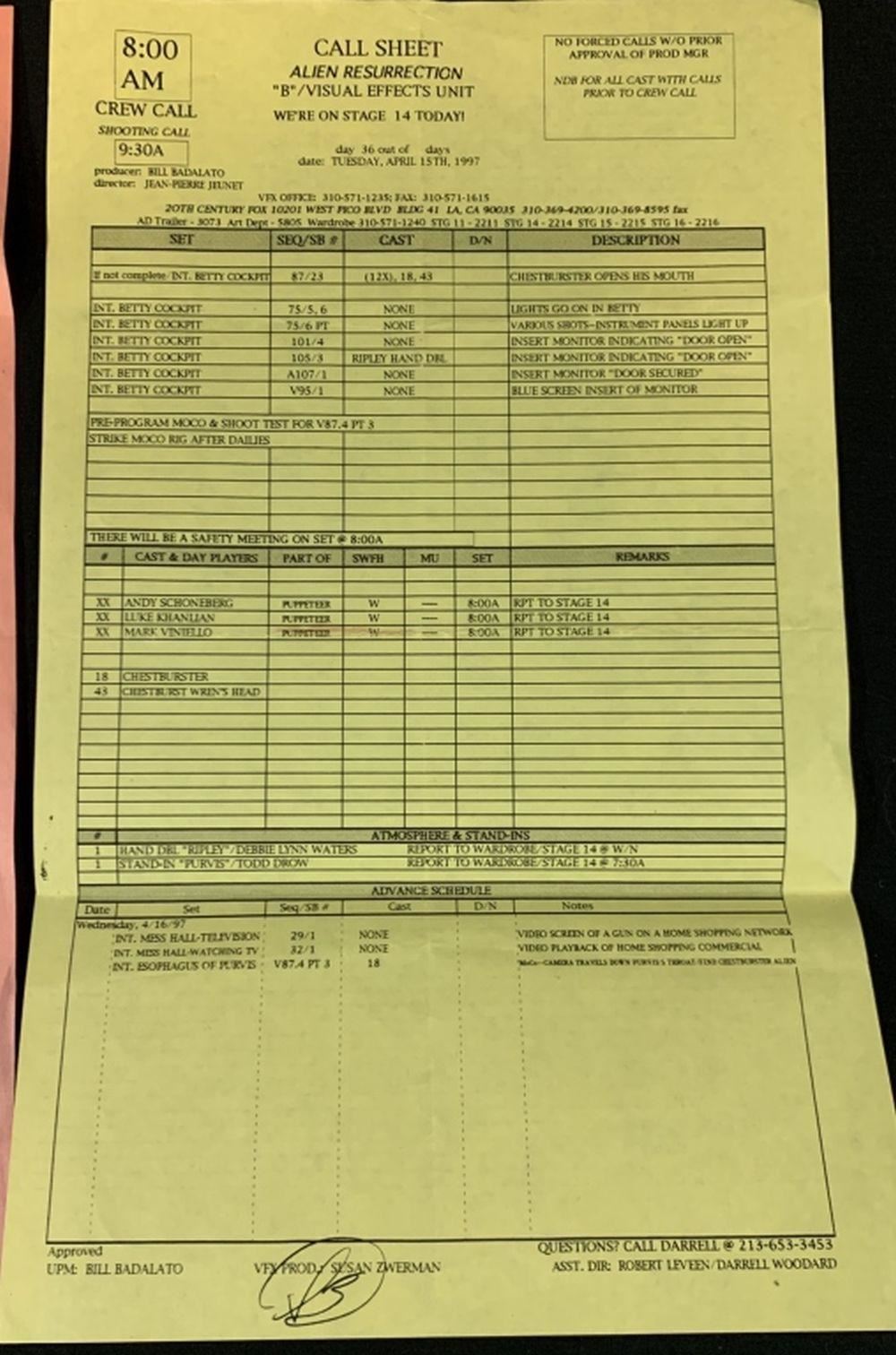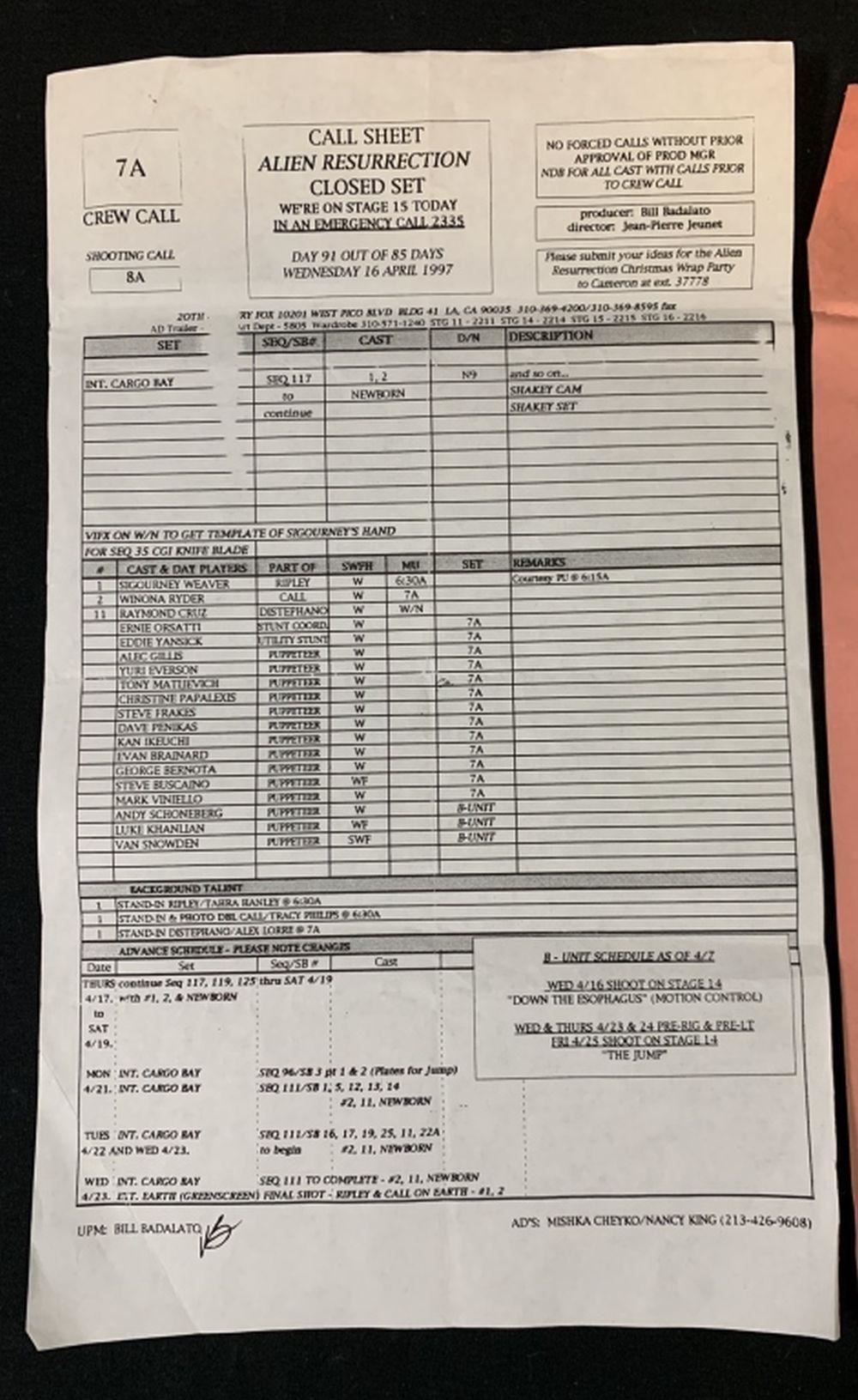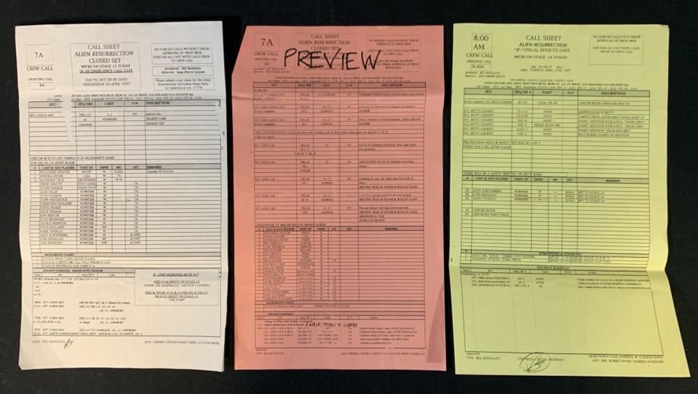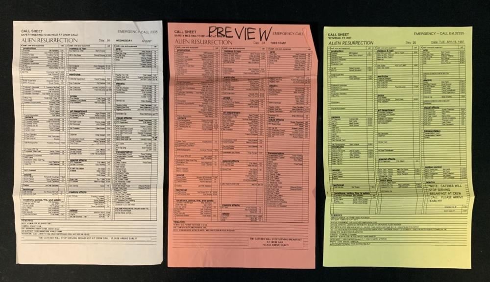 Original set of 3 crew call sheets used on the production of the Jean-Pierre Jeunet directed science fiction horror film "Alien Resurrection" (1997). 200 years after her death, Ellen Ripley is revived as a powerful human/alien hybrid clone. Along with a crew of space pirates, she must again battle the deadly aliens and stop them from reaching Earth.