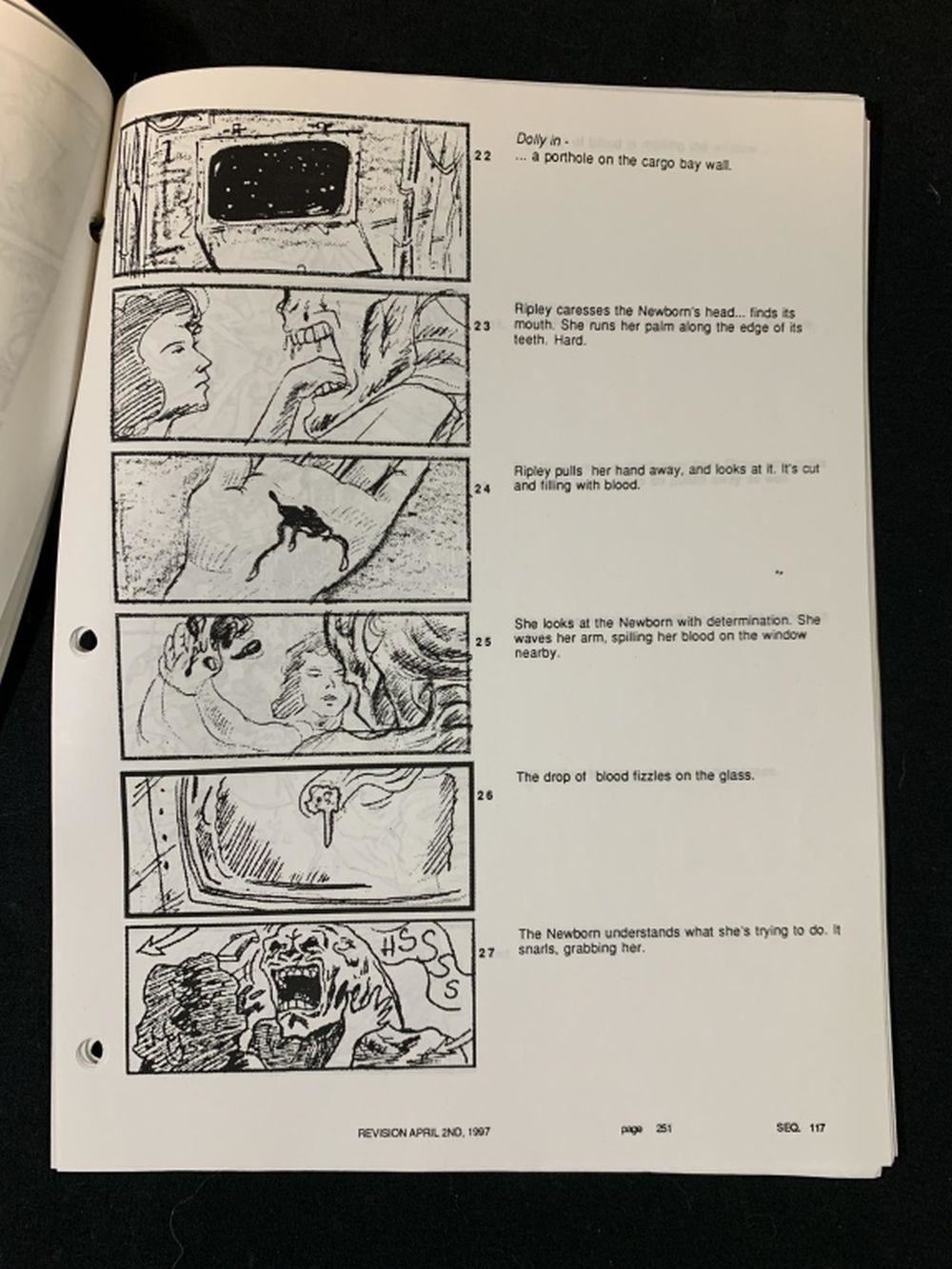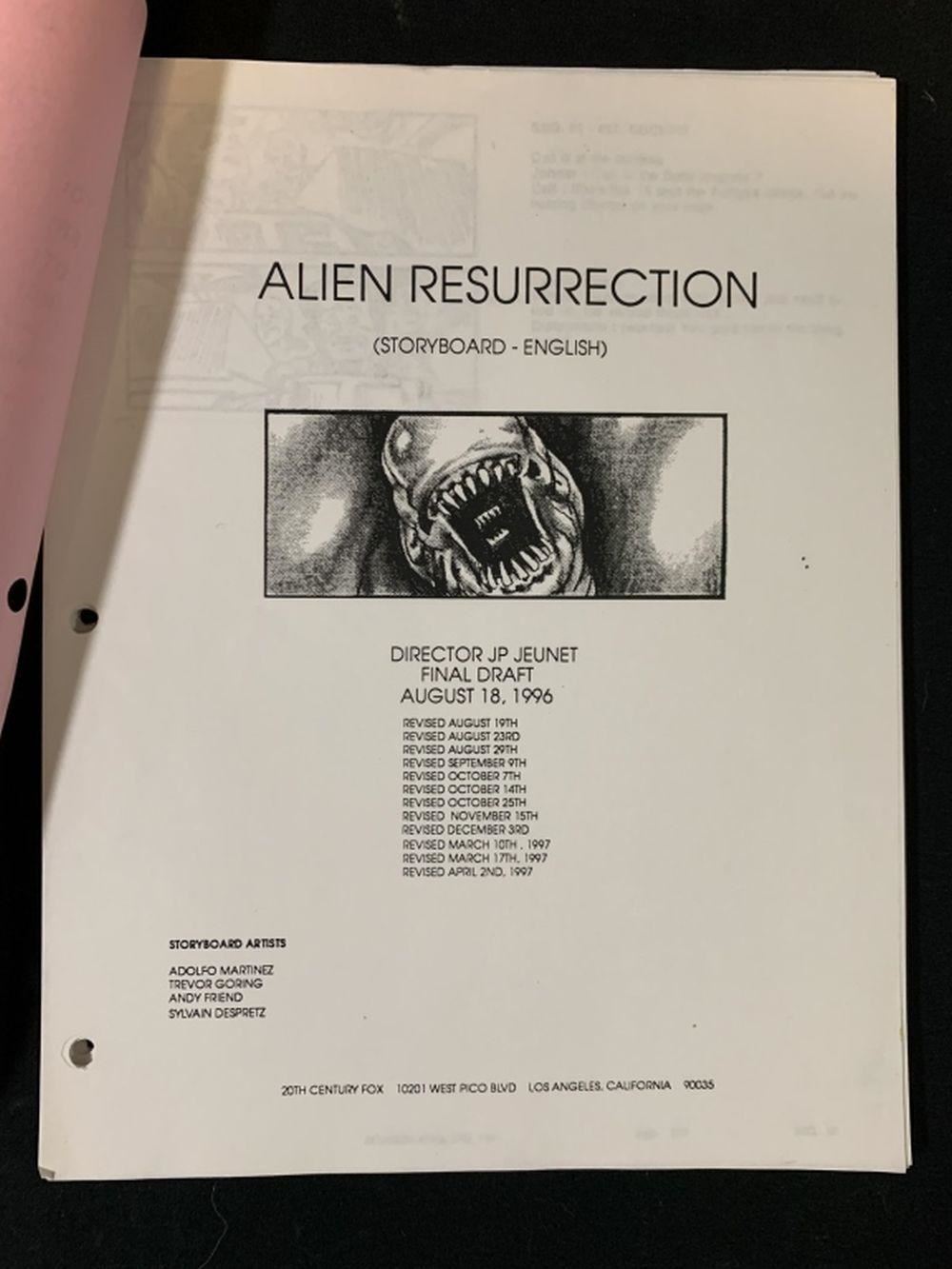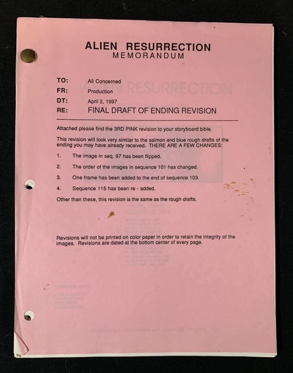 Original storyboard bible (Print) 3rd pink revision (Final draft of ending revision) consisting of pages, used on the production of the Jean-Pierre Jeunet directed science fiction horror film "Alien Resurrection" (1997). 200 years after her death, Ellen Ripley is revived as a powerful human/alien hybrid clone. Along with a crew of space pirates, she must again battle the deadly aliens and stop them from reaching Earth.