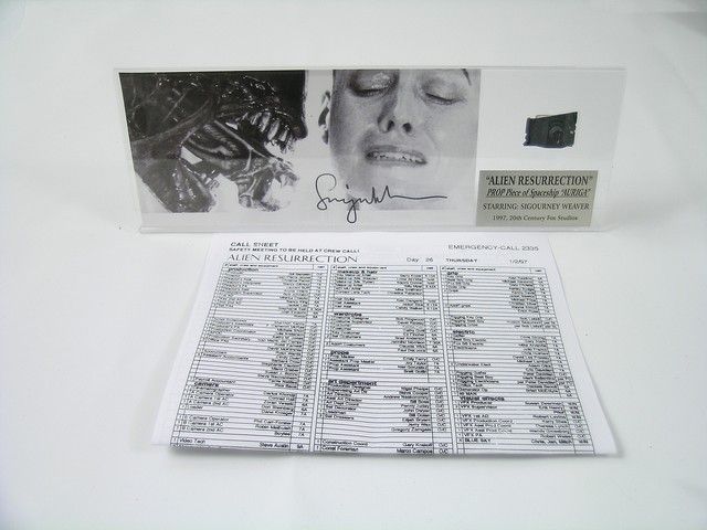 From the final chapter "Alien: Resurrection" (1997) from the blockbuster outer space thriller franchise, this is a piece of the spaceship "Auriga", The authentic piece from the screen used model is professionally mounted on Plexiglass and includes a copy of star Sigourney Weaver as Ripley with a reproduction of her signature. it also includes a plaque reading: "ALIEN RESURRECTION - PROP PIECE OF SPACESHIP AURIGA - STARRING SIGOURNEY WEAVER - 1997 - 20TH CENTURY FOX STUDIOS". Also included is an official Call Sheet from the production (Day 26, 1/2/97). Model prop piece is approx. 1"x1", and the display is approx. 12"X4"). comes with a COA for both the prop piece and the Call Sheet.