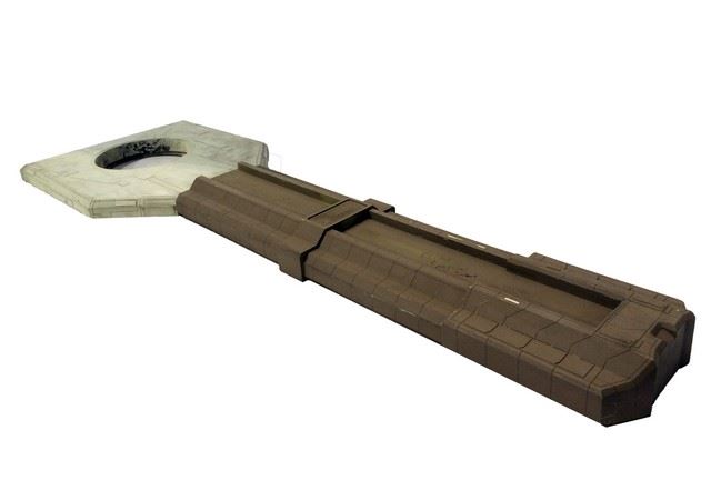 This wood, sintra and styrene pattern is the hand made master pattern used to create the molds for the docking bay arm where. the Space Freighter Betty docks. This piece was then molded and cast in fiberglass and resin. 66" long x 21" wide. This incredible, handmade miniature is from the celebrated collection of Academy Award winning New Deal Studios. New Deal Studios is a 21st Century Media Studio, unlike any in the world. A full-service film production and visual effects studio, with over 20 years of iconic imagery, New Deal Studios develops, designs, prototypes, and creates all types of high caliber media projects. Founded in 1995 by Matthew Gratzner, Ian Hunter and Shannon Blake Gans, this artist owned and operated independent studio, born in the heyday of visual effects, has truly evolved into the technology driven studio for the future, consistently delivering the perfect marriage of artistry and technology. Award winning credits by New Deal Studios include high-profile projects such as Dark Knight Rises, Hugo, The Avengers, Oz the Great and Powerful, Iron Man, The Dark Knight, Watchmen, I am Legend, Night at the Museum, Whiteout, 2012, Alice in Wonderland, Inception, Battleship and Interstellar.