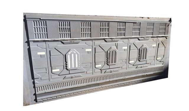 Styrene and sintra hand made master pattern used for detail panels in the docking bay. Designed and fabricated by New Deal Studios Co-founder, Matthew Gratzner. This piece was then molded and cast in urethane resin. 39" long x 17" tall. This incredible, handmade miniature is from the celebrated collection of Academy Award winning New Deal Studios. New Deal Studios is a 21st Century Media Studio, unlike any in the world. A full-service film production and visual effects studio, with over 20 years of iconic imagery, New Deal Studios develops, designs, prototypes, and creates all types of high caliber media projects. Founded in 1995 by Matthew Gratzner, Ian Hunter and Shannon Blake Gans, this artist owned and operated independent studio, born in the heyday of visual effects, has truly evolved into the technology driven studio for the future, consistently delivering the perfect marriage of artistry and technology. Award winning credits by New Deal Studios include high-profile projects such as Dark Knight Rises, Hugo, The Avengers, Oz the Great and Powerful, Iron Man, The Dark Knight, Watchmen, I am Legend, Night at the Museum, Whiteout, 2012, Alice in Wonderland, Inception, Battleship and Interstellar.