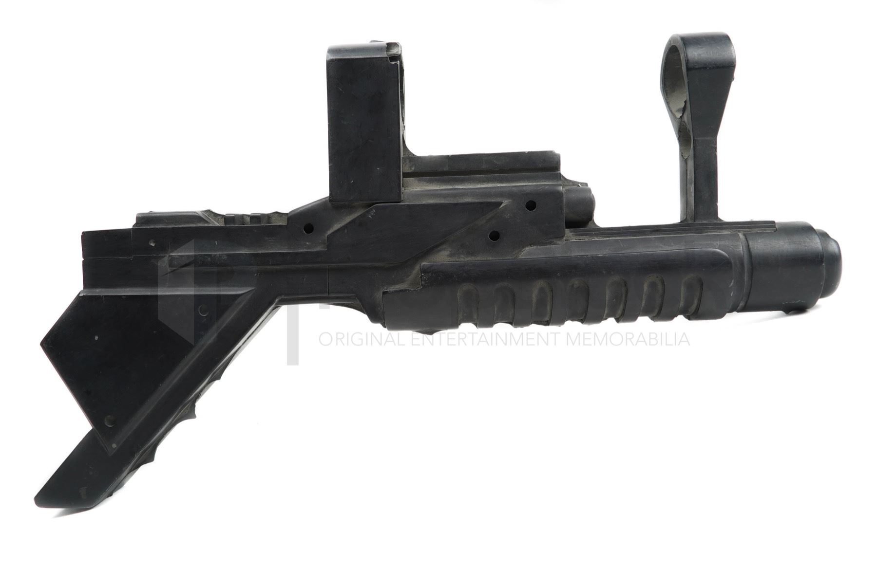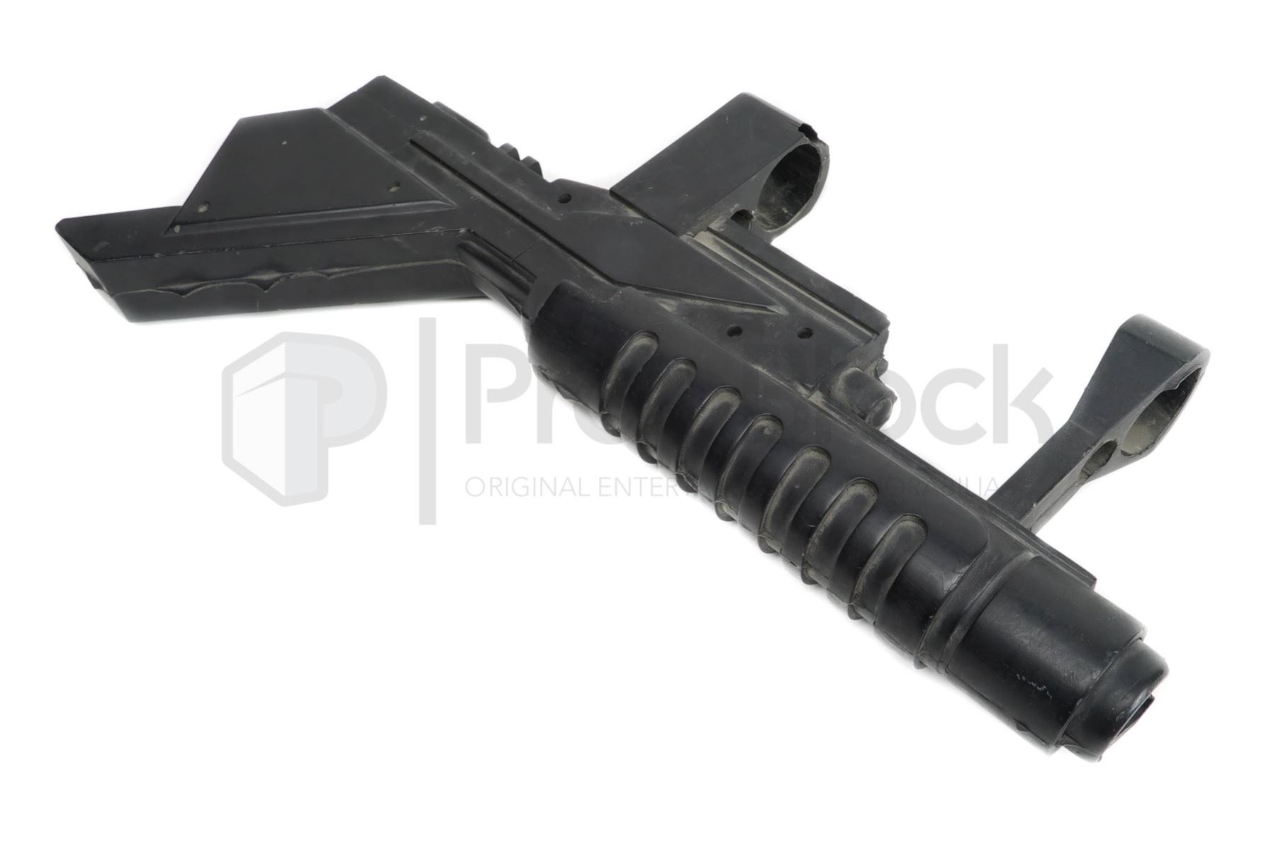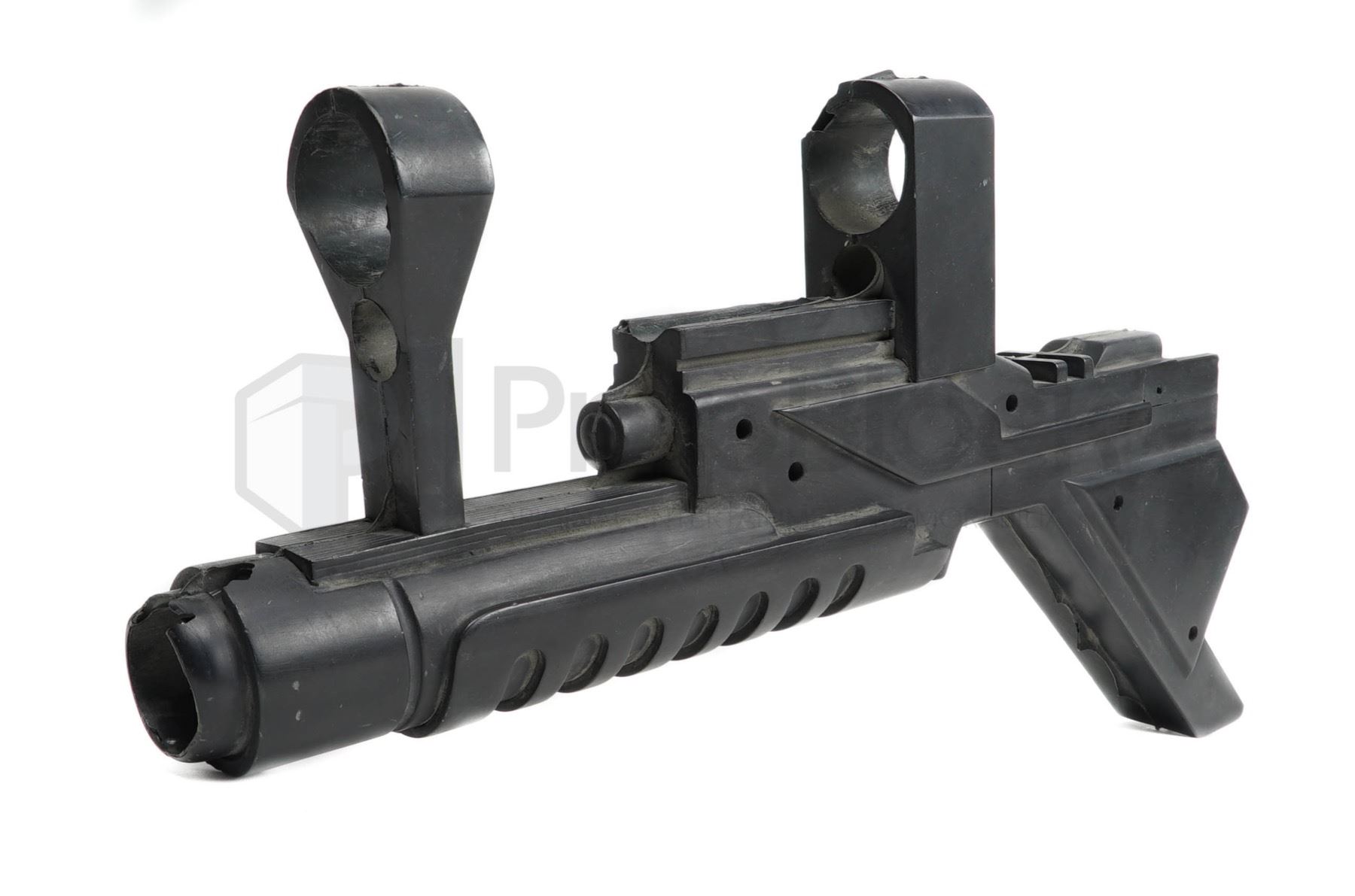 Lower burner attachment for the USM double barrel rifle featured in the 1997 science fiction film Alien: Resurrection. This attachment can be seen on the USM (United Space Marine) weapons, most noticeably on the one used by Ripley, actress Sigourney Weaver in the film. Made of cast resin, this piece is black in color and was created by the props department of the film as a backup. This piece remains in excellent, production made condition.