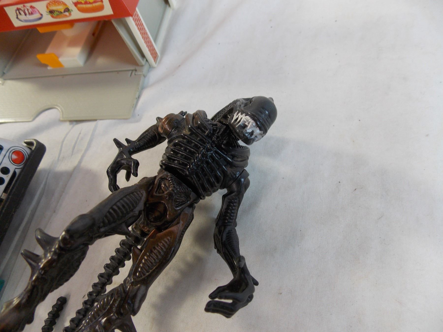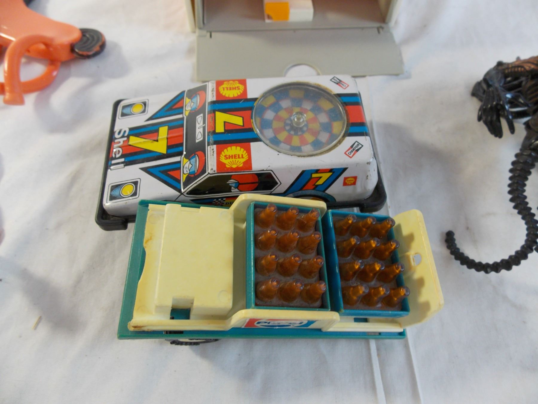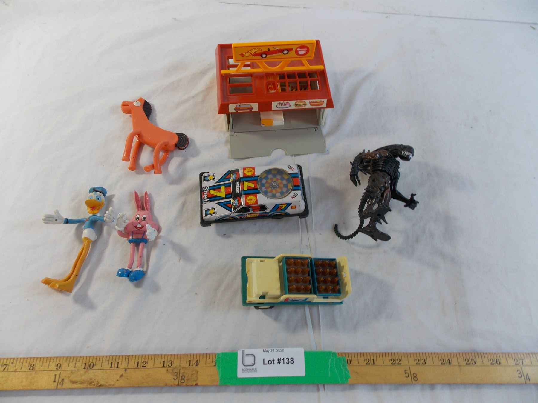 Alien toy, Hot Wheels garage, shell + pepsi car, (3) bendies