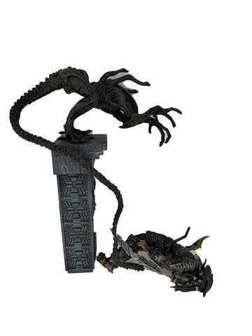 Set of Alien vs. Predator action figure collection (unboxed), including a Predator action figure (right arm detached), an Alien attacking a Predator and an Alien egg. (8" each figure, egg is 7" tall). This was on display in the production office to inspire a series of films in the making. From Constantine Film's production office archives which was likely used for reference material.