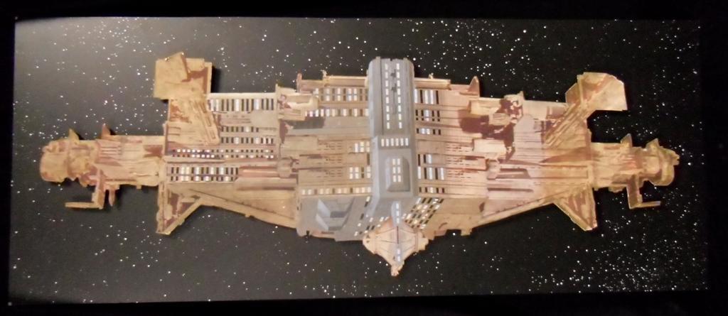 Aliens (1986) - A production made giant matte painting of the Gateway spaceship used for early tests by James Cameron. Hand painted and created on a very large and heavy wooden board is the star background with a fore-layer of the spaceship. Acquired directly from 20th Century Fox. 29" x 72". Oversized item. Additional shipping charges required.