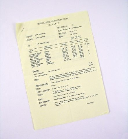James Cameron made a major splash when he took the reigns of the smash-hit sequel "Aliens" (1986). He was given a miniscule budget, but what went on the screen looked was something wonderful! This is a rare original Call Sheet from the historic production.