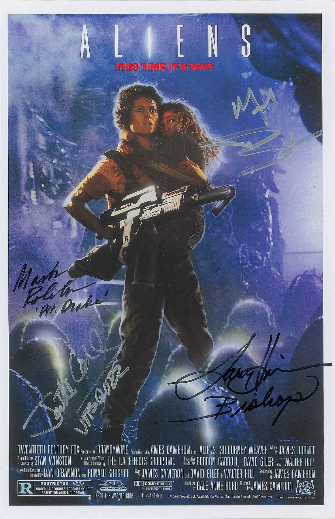 Color semi-glossy 11 x 17 photo of the poster for the 1986 action sci-fi film Aliens, signed in silver ink by Michael Biehn and Jenette Goldstein, who adds "Vasquez," and in black felt tip by Mark Rolston, who adds "'Pvt. Drake,'" and Lance Henriksen, who adds "Bishop." In very fine condition.