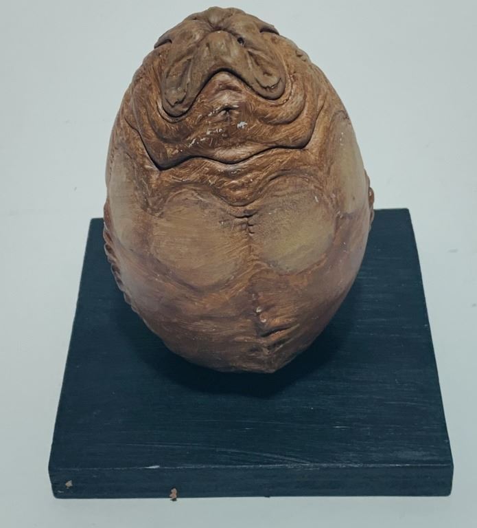 Original maquette of an alien egg used in the production of the Colin and Greg Strause directed science fiction action film 'Aliens vs. Predator: Requiem' (2007). Set immediately after the events of the previous film, the film begins with a Predator ship crashing into a forest outside of Gunnison, Colorado, where an Alien-Predator hybrid known as the Predalien escapes and makes its way to the nearby small town. A skilled veteran Predator is dispatched to kill the Predalien, and the townspeople try to escape the ensuing carnage.