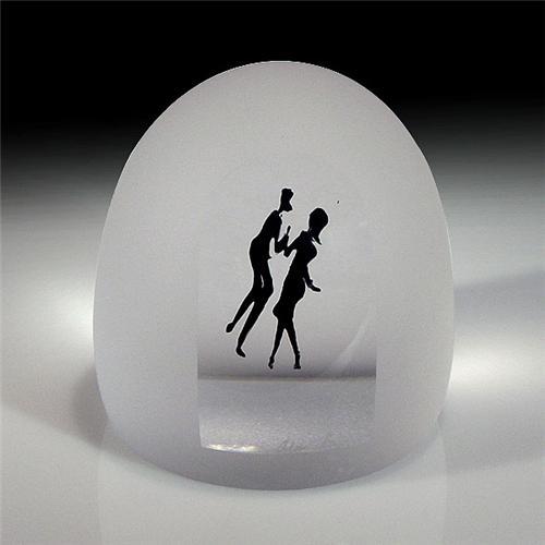 Alison Ruzsa "Dancing Couple" high-domed frosted window paperweight. The piece contains the black silhouette of a dancing couple, visible through a clear front window. Signed. Height 2 3/4", diameter of base 2 5/8". <p>Each winning bidder will receive one copy of "All About Paperweigths" and a paperweight stand for each paperweight won. (One book per winner, one stand per paperweight).