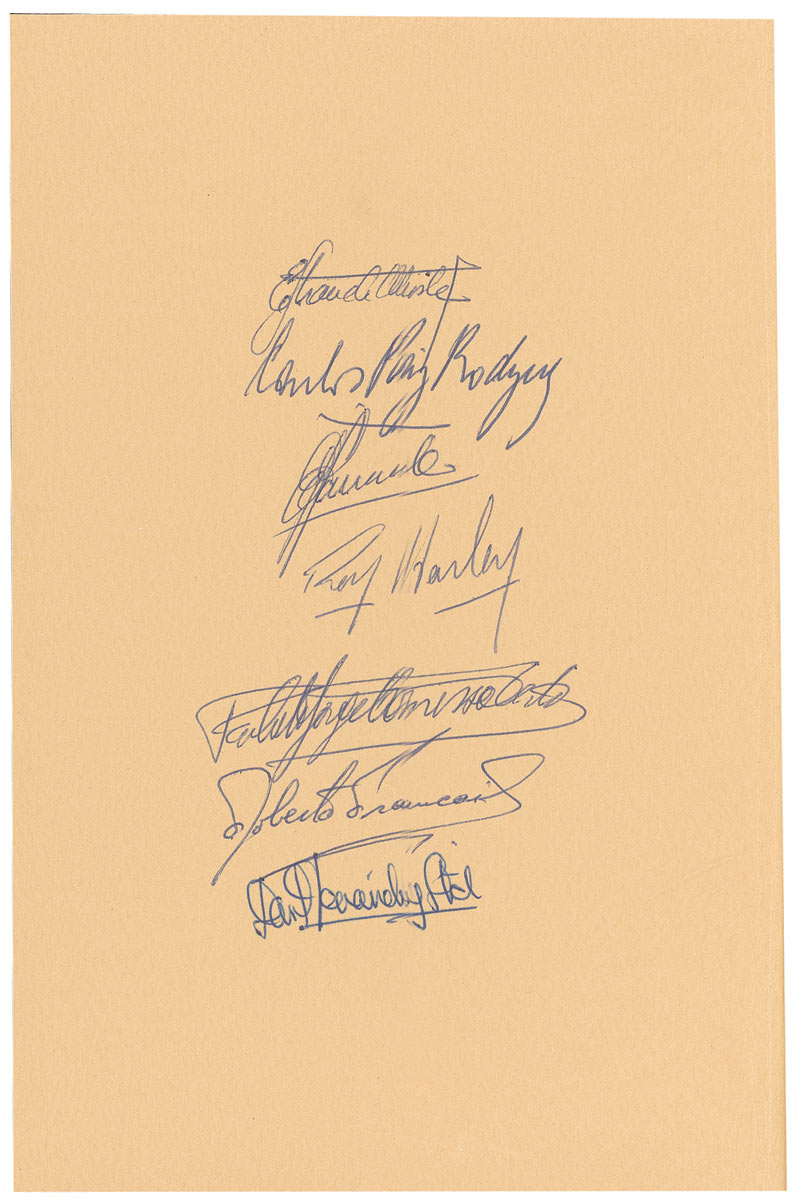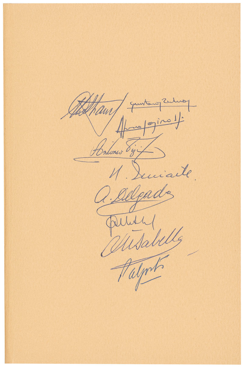 Signed book: Alive: The Story of the Andes Survivors. First edition. Philadelphia: J. B. Lippincott, 1974. Hardcover with dustjacket, 6.5 x 9.5, 352 pages. Signed on the inside front cover and first free end page by all 16 of the survivors. Tears, creases and paper loss to dustjacket, otherwise fine condition.