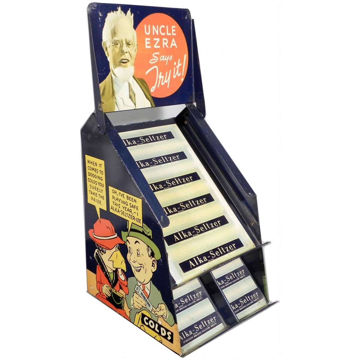 Alka-Seltzer Tin Store Display. Featuring "Uncle Ezra". Excellent condition. 7 1/2 X 17 X 9 inches.