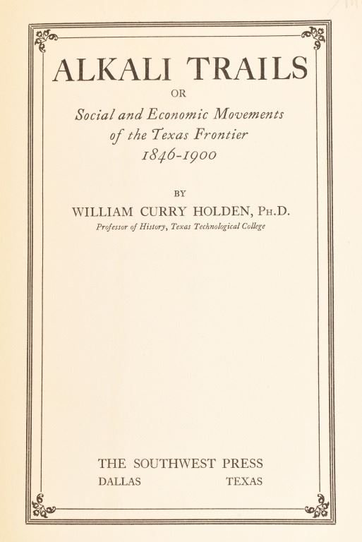 Alkali Trails: Or Social and Economic Movements of the Texas Frontier 1846-1900. 1930 First Edition. Published by The Southwest Press. By William Curry Holden, PhD, professor of history, Texas Technological College. Dallas Texas.