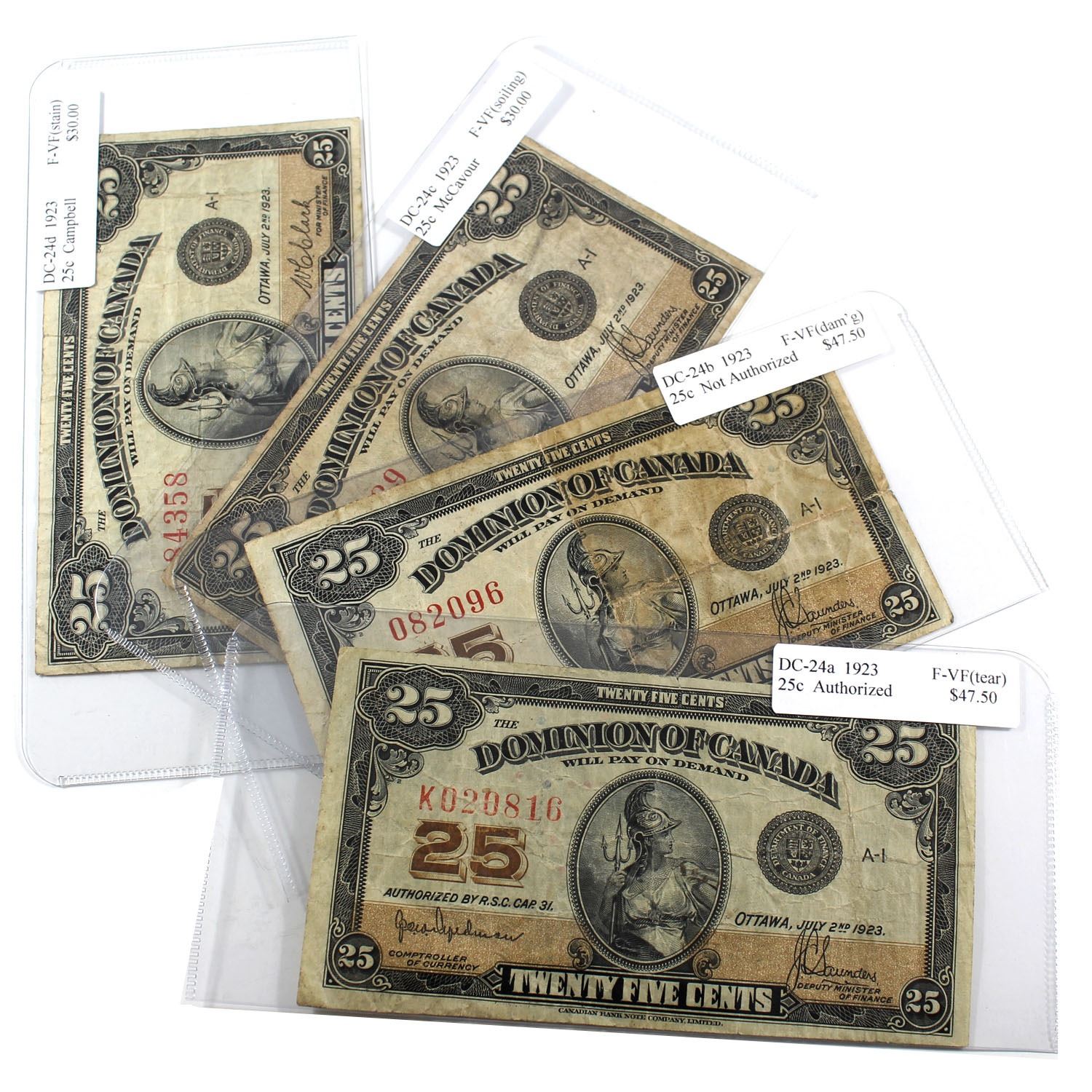 All 1923 25c Dominion of Canada Note Varieties - DC-24a, DC-24b, DC-24c & DC-24d all F-VF. Notes contain minor impairments. 4pcs
