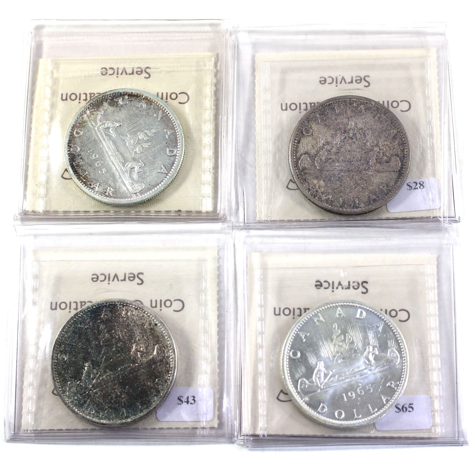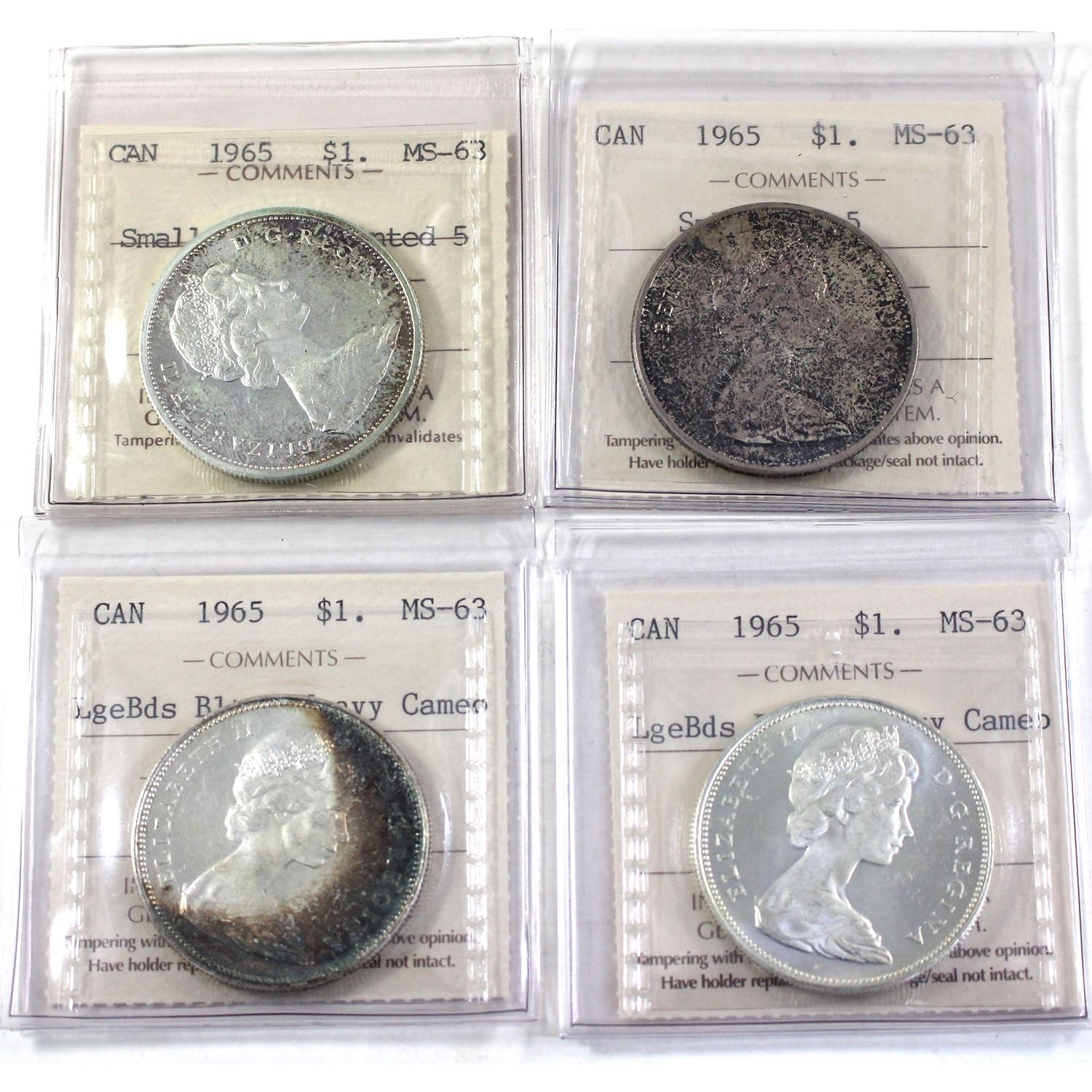 All 4 Type Varieties of the 1965 Silver $1 ICCS Certified MS63 - Small Beads Pointed 5, Small Beads Blunt 5, Large Beads Blunt 5 Cameo & Large Beads Pointed 5 Cameo. 4pcs